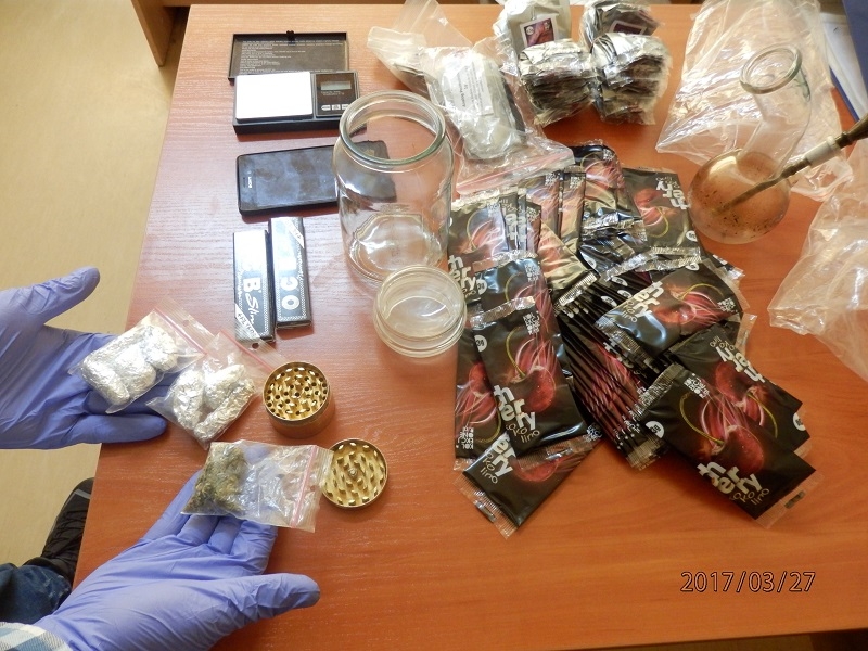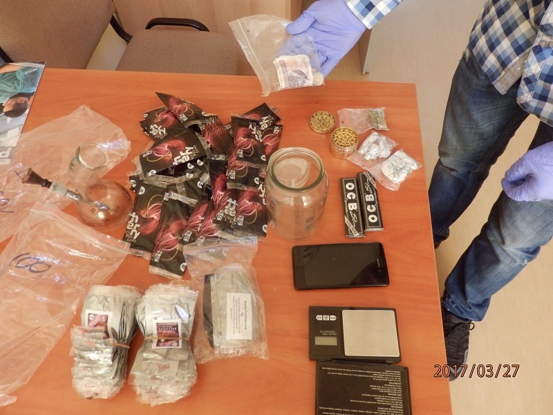 Policjanci ustalili, gdzie młodzi ludzie dokonali zakupu. Nie zwlekając udali się do mieszkania 26 – letniego mężczyzny. W trakcie przeszukania ujawnili tam 10 gramów zielonego suszu, przeprowadzone wstępne testy wykazały, że jest to marihuana. Dalsze czynności przeszukania ujawniły 150 oryginalnie zamkniętych torebek tzw. dopalaczy, wagę elektroniczną, pieniądze oraz szklaną fifkę.