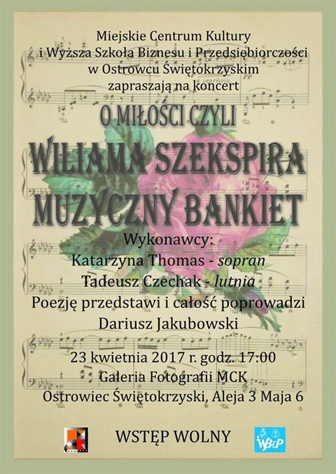 Zainaugurowane zostaną w niedzielę 23 kwietnia o godz. 17.00 w Galeria Fotografii MCK spektaklem muzycznym pt. „O miłości, czyli Williama Szekspira muzyczny bankiet”. Będzie to żywe spotkanie z publicznością, hybrydowa forma koncertu, w trakcie którego usłyszymy muzykę w oryginale staroangielskim, wykonywaną zgodnie z kanonami epoki, oraz poezje w mistrzowskich translacjach Stanisława Barańczaka. Zaśpiewa sopranistka Katarzyna Thomas, na lutni zagra Tadeusz Czechak, poezję przedstawi i całość poprowadzi Dariusz Jakubowski – aktor znany z polskich produkcji teatralnych, filmowych i telewizyjnych. Wstęp na wydarzenie jest darmowy.