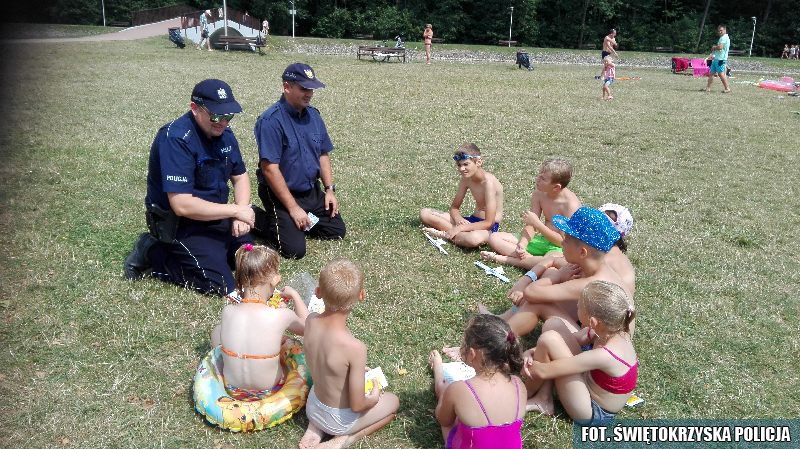 Policjantka z Zespołu Profilaktyki Społecznej asp. Maja Słowik wraz z dzielnicowym mł.asp. Mariuszem Kwietniem i funkcjonariuszem ostrowieckiej Straży Miejskiej Michałem Sitarskim edukowali dzieci spędzające letni wypoczynek na terenie Ośrodka Wypoczynkowego "Gutwin" w Ostrowcu Świętokrzyskim.