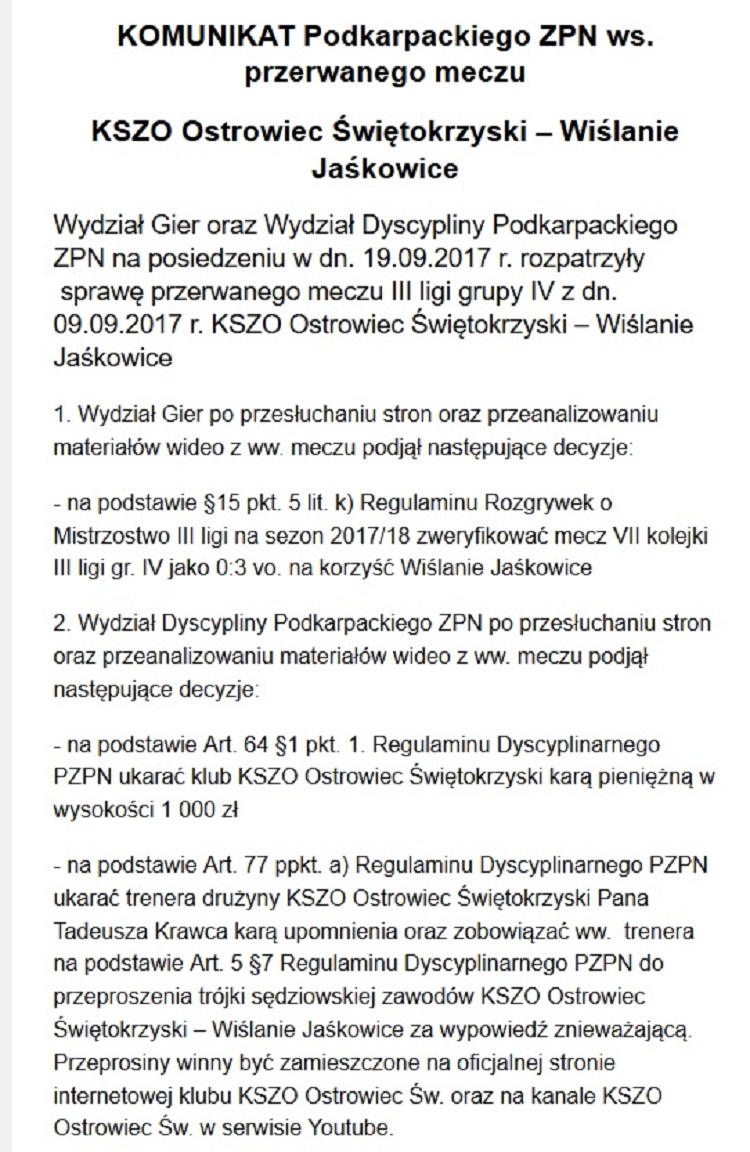 Ponadto, związek postanowił ukarać trenera Tadeusza Krawca karą upomnienia oraz zobowiązać go do przeproszenia trójki sędziowskiej za wypowiedź znieważającą.