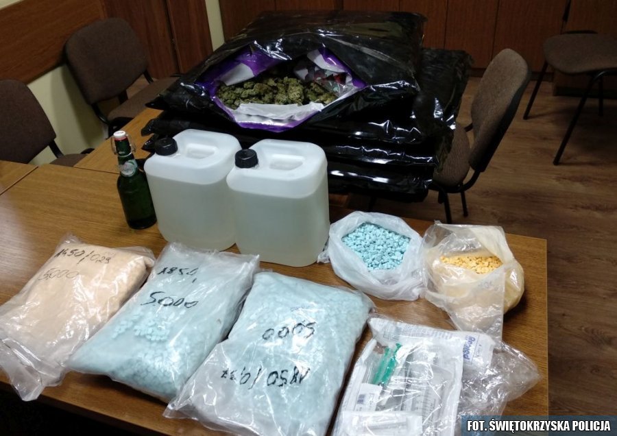 Do pierwszej sytuacji doszło 1 marca, chociaż praca funkcjonariuszy w tej sprawie rozpoczęła się już wcześniej. Wtedy to policjanci sprawdzili swoje przypuszczenia co do mężczyzn, którzy mogą trudnić się narkotykowym procederem. Przed godziną 19 zapukali do drzwi 66-letniego mieszkańca Starachowic. W domu oraz w garażu policjanci znaleźli różnego rodzaju zakazane substancje. Zabezpieczono prawie 13 kg marihuany, 10 litrów płynnej amfetaminy, z której można uzyskać około 14 kg amfetaminy w proszku oraz prawie 19 tysięcy sztuk tabletek MDMA, potocznie zwanych extazy. Policjanci podczas wykonywania czynności zatrzymali również drugiego mężczyznę, który najprawdopodobniej ma związek z tym przestępczym procederem. Był to 36-letni mieszkaniec Starachowic. Obaj zostali doprowadzeni do Prokuratury Okręgowej w Kielcach gdzie usłyszeli zarzuty udziału w obrocie zakazanymi prawem środkami i zostali tymczasowo aresztowani na trzy miesiące. Grozi im do 12 lat pozbawienia wolności.