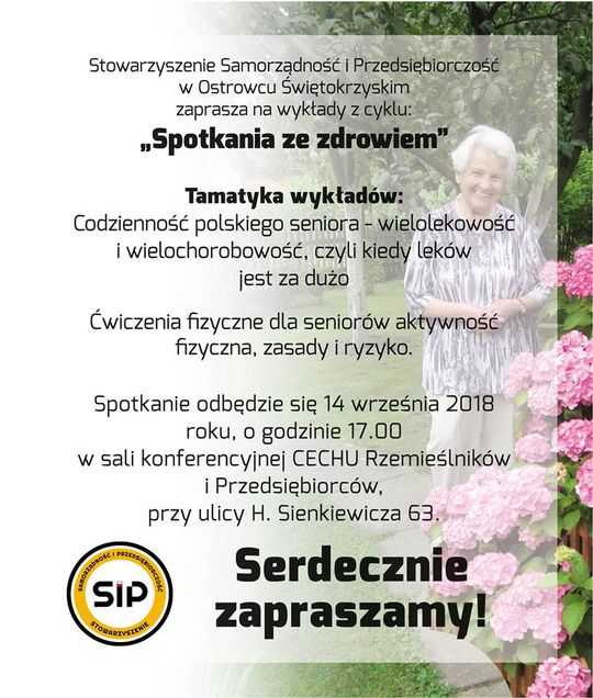 W piątek 14 września o godzinie 17:00 w sali konferencyjnej CECHu Rzemieślników i Przedsiębiorców przy ulicy Henryka Sienkiewicza 63 w Ostrowcu Świętokrzyskim odbędą się wykłady dla seniorów z cyklu "Spotkania ze zdrowiem".