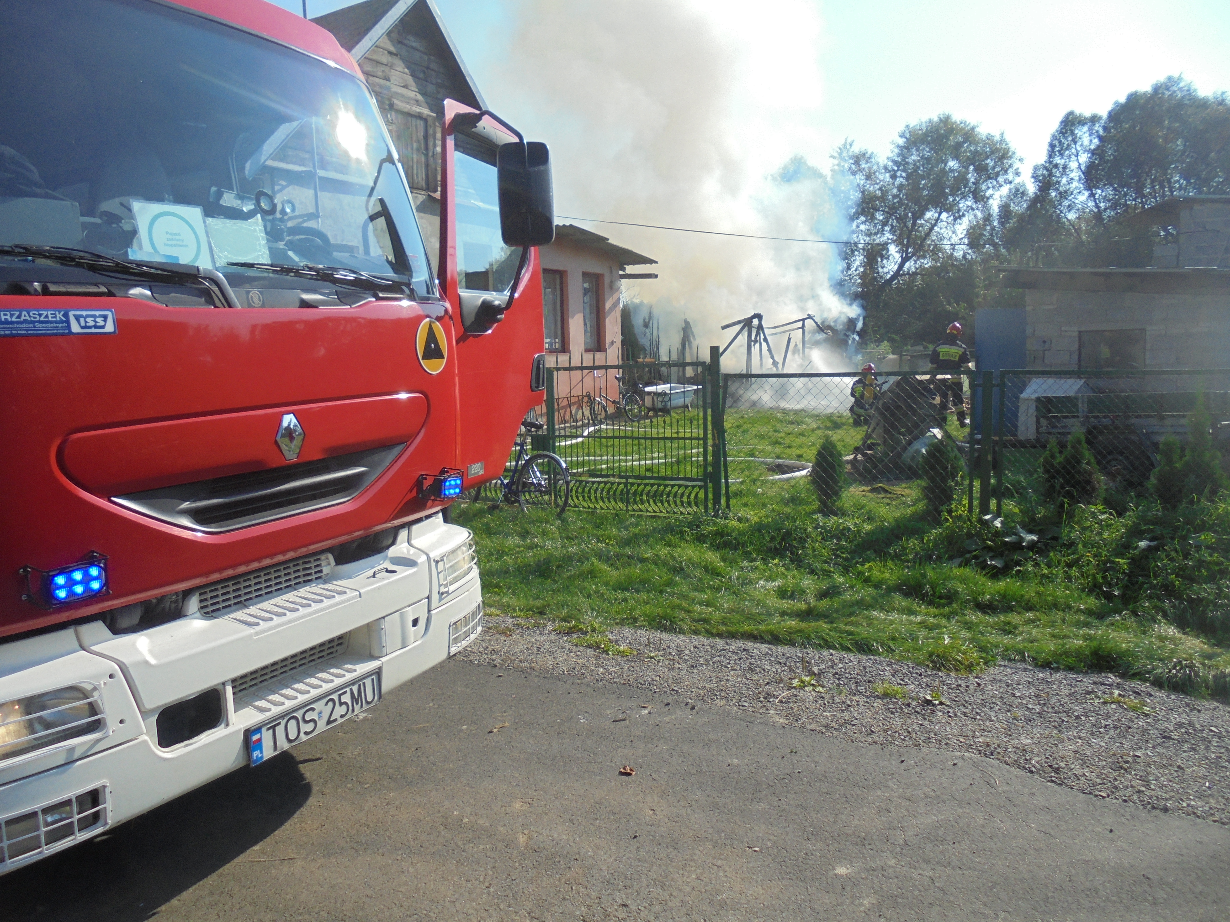 Pożarem objęta została cała drewniana szopa kryta eternitem. Przy tak łatwopalnym materiale, istniało poważne zagrożenie rozprzestrzenienia się pożaru na sąsiadujący budynek mieszkalny. Drugie zagrożenie stanowiły odnalezione wewnątrz budynku dwie butle na gazy sprężone tlen i acetylen. Strażacy, aby uniknąć wybuchu, schładzali je rozproszonym prądem wody.