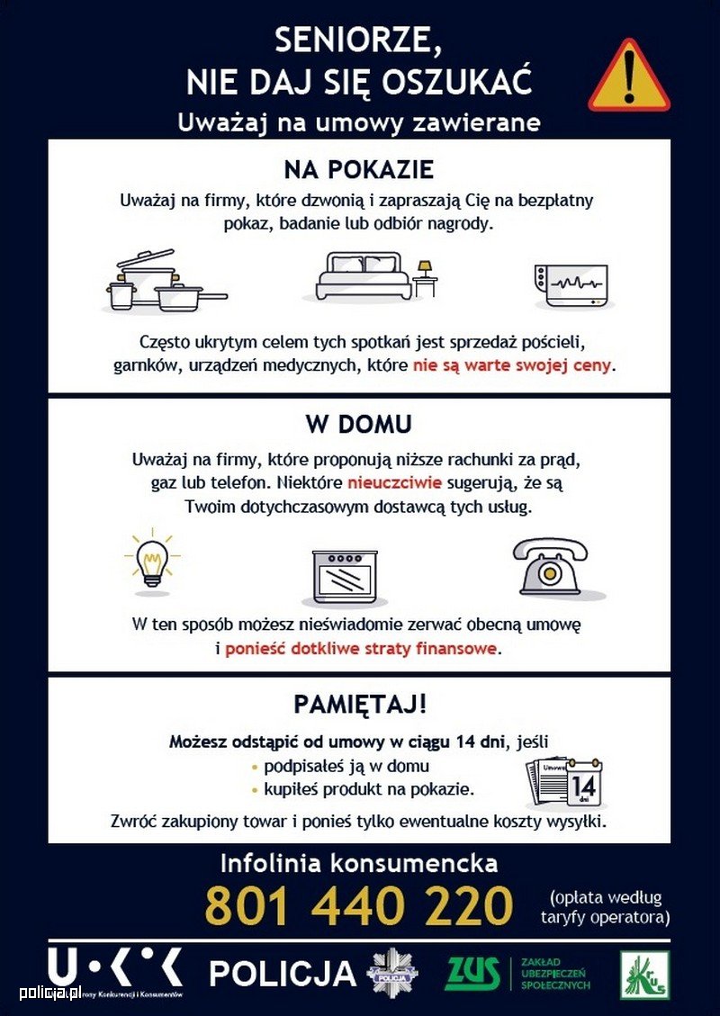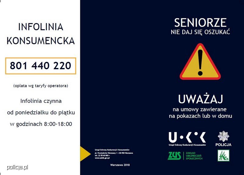 Dlatego tak ważne jest budowanie świadomości w tym zakresie. Kampania tworzona wspólnie przez instytucje mające na co dzień kontakt osobami starszymi ma w tym pomóc. Na jej potrzeby zostało przygotowanych przez UOKiK 350 tysięcy sztuk bezpłatnych informatorów oraz 3 tysiące plakatów. Materiały te będą dystrybuowane podczas spotkań przedstawicieli wymienionych instytucji z seniorami oraz dostępne w siedzibach ZUS i KRUS, czyli miejscach często odwiedzanych przez seniorów.