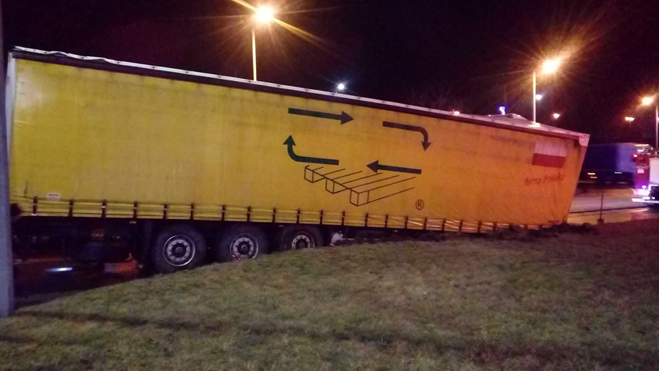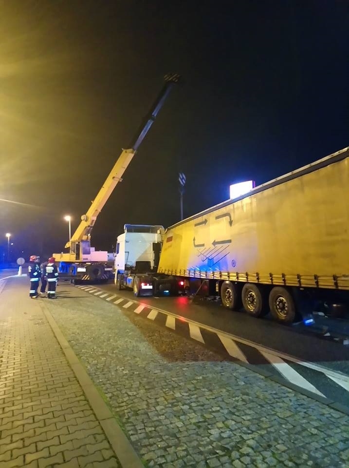 Do zdarzenia natychmiast wysłano 3 samochody ratowniczo-gaśnicze oraz 9 strażaków. Po przybyciu na miejsce zdarzenia strażacy stwierdzili, że na jednym z pasów ulicy Wąskiej samochód ciężarowy wraz z naczepą blokuje ruch drogowy. Naczepa ciężarówki z nieznanych przyczyn, podczas jazdy odpięła się od ciągnika siodłowego uszkadzając korek paliwowy co spowodowało niewielki wyciek oleju napędowego z pojazdu.