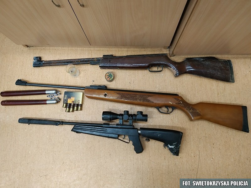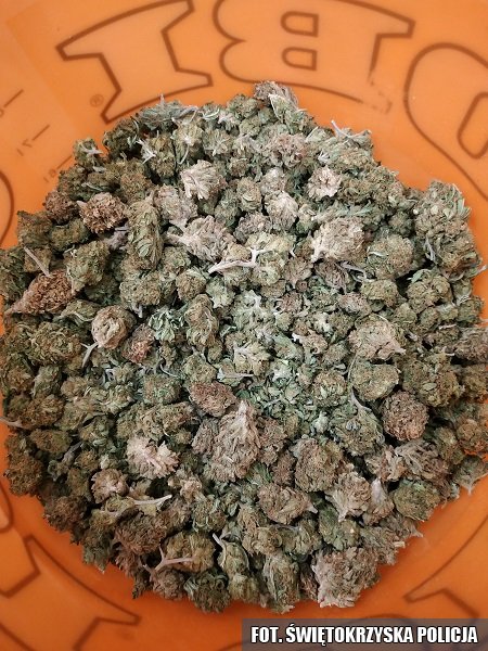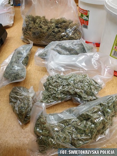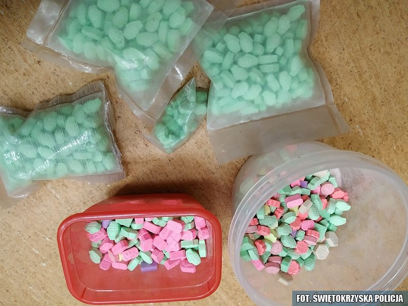 Ostrowczanin w swoich dwóch mieszkaniach przechowywał blisko kilogram amfetaminy, ponad 6 kg marihuany, ponad 800 tabletek "extasy", 1,5 litra oleju konopnego oraz aparaturę do jego wytwarzania. Podczas przeszukania policja znalazła cztery wagi elektroniczne, metalową kruszarkę, pojemnik z nasionami konopi, telefony komórkowe, etui z zawartością wytrychów, dwie sztuki broni pneumatycznej, broń małokalibrową z celownikiem optycznym oraz 7 sztuk amunicji i broń białą typu nunczako.