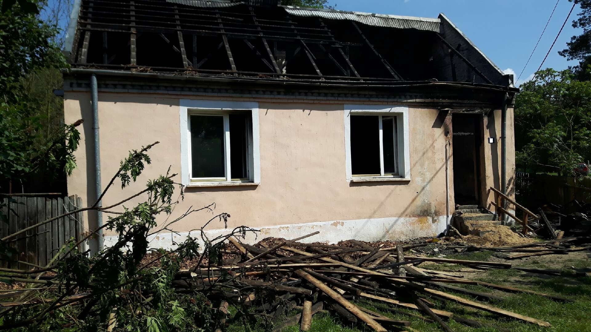 Po przybyciu na miejsce strażacy stwierdzili, że pożarem objęty był cały budynek mieszkalny, jednorodzinny (parter oraz poddasze nieużytkowe). Na zewnątrz znajdowała się właścicielka budynku wraz z dwoma synami, która poinformowała nas, że w budynku nie ma żadnych osób. Jeden z mężczyzn miał niewielkie poparzenia ciała.