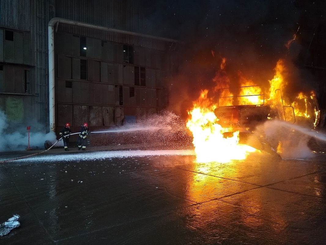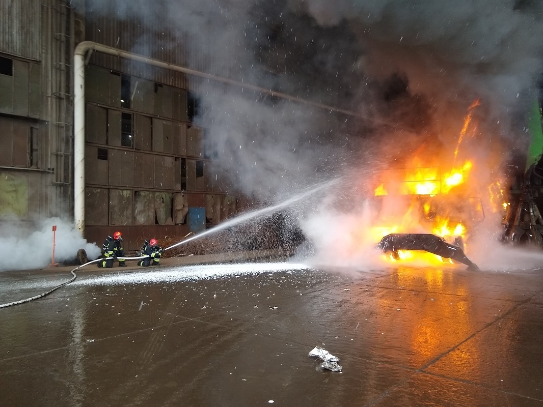Do zdarzenia natychmiast zadysponowano 4 samochody ratowniczo-gaśnicze – 12 strażaków. Po przybyciu ratowników na miejsca akcji stwierdzono, że pod metalową wiatą pali się już na całej swojej objętości ładowarka do złomu. Istniało zagrożenie rozprzestrzenienia się pożaru na pobliską halę produkcyjno-magazynową. Działania strażaków w pierwszej kolejności polegały na zabezpieczeniu miejsca zdarzenia i ugaszeniu pożaru przy pomocy dwóch prądów piany ciężkiej. Na tym działania zakończono. Akcja trwała ponad godzinę.