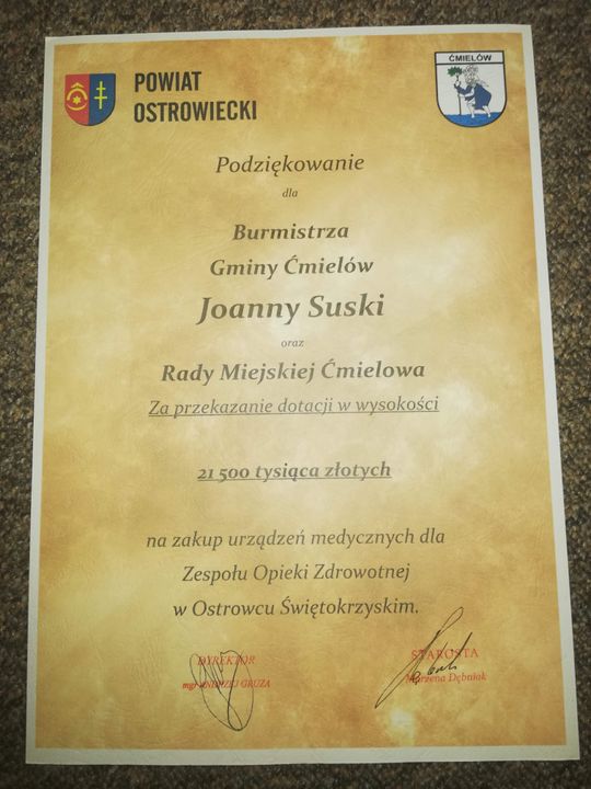 Zgodnie z umową zawartą pomiędzy Gminą Ćmielów a Powiatem Ostrowieckim, gmina za zgodą Rady Miejskiej przekazała powiatowi 21 500,00 zł na zakup aparatu do znieczuleń o wartości 159 084,00 zł.