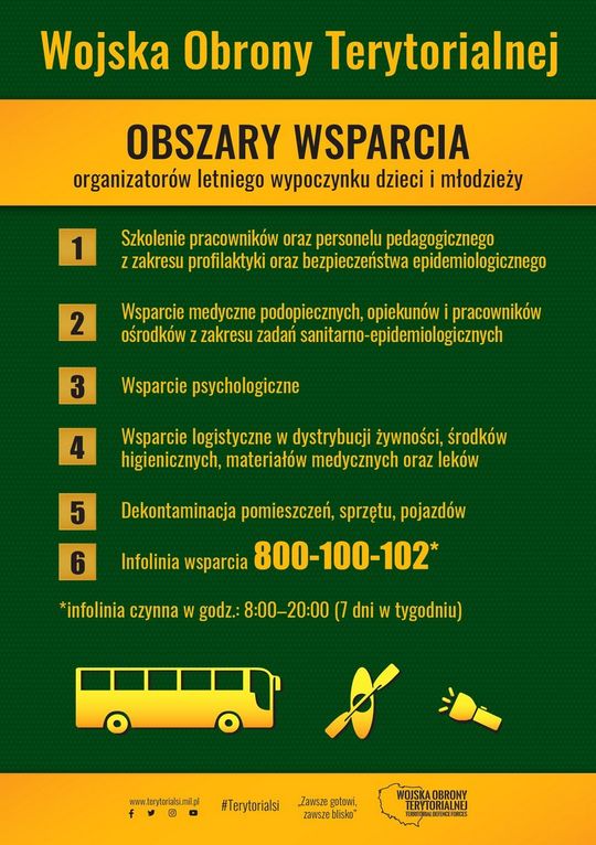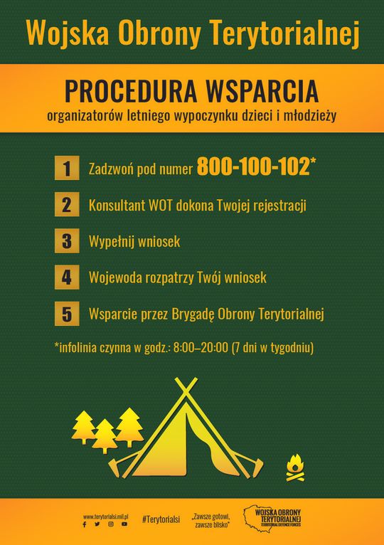 W celu zapewnienia efektywnego wsparcia organizatorów wypoczynku w Dowództwie WOT uruchomiono dla nich infolinię. Pod numerem 800-100-102 przez 7 dni w tygodniu, w godzinach 8:00–20:00, dyżurują żołnierze OT - przeszkoleni i doświadczeni w organizowaniu wypoczynku zbiorowego, którzy udzielą szczegółowych informacji na temat zasad, uwarunkowań prawnych i możliwości wsparcia przez Wojsko Polskie.