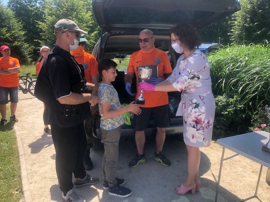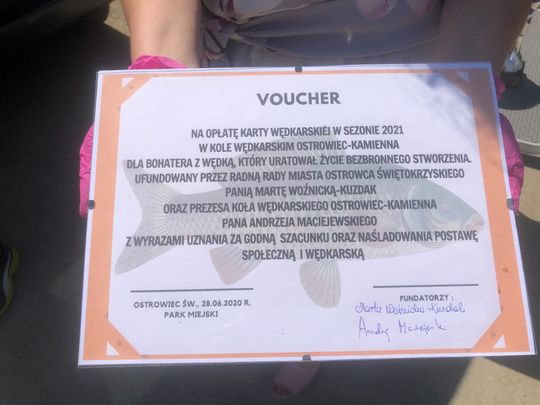 Członkowie Koło PZW Ostrowiec Kamienna podczas dzisiejszych zawodów postanowili uhonorować pana Pawła, który tydzień temu będąc na rybach, wyłowił z rzeki Świślina w gminie Kunów, skatowanego psa. Natychmiast o zdarzeniu powiadomił policję, a dzięki jego szybkiej interwencji udało się zwierzę uratować. Pan Paweł od kolegów otrzymał specjalny voucher i zaproszenie do członkostwa w Kole Ostrowiec Kamienna. Zaproszenie zostało przyjęte i w sezonie 2021 pan Paweł dołączy do ostrowieckich wędkarzy.