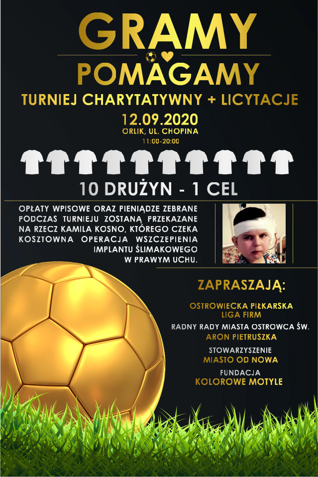 Czasu jest niewiele, a pieniądze są niezmiernie potrzebne dlatego też lokalna społeczność wzięła sprawy w swoje ręce i organizuje wydarzenia charytatywne dla Kamilka Kosno, w sobotę 12 września na orliku przy ulicy Fryderyka Chopina rozegrany zostanie turniej piłki nożnej. Na turnieju obecni będą wolontariusze z puszkami, do których będzie można wrzucać datki również wpisowe od drużyn piłkarskich zostanie przekazane na leczenie Kamila Kosno.