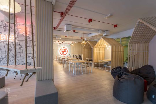 Wszyscy wiemy, że nie samą nauką i pracą człowiek żyje. Karierę robi ostatnio angielskie słowo wellbeing, oznaczające dobrostan. By nasz umysł był w formie, byśmy byli w dobrej kondycji psychicznej dobrze jest znaleźć nieco czasu na relaks. Nam udało się także wykroić na ten cel sporo miejsca. W tej części, nazwijmy ją „relaksacyjną” w oczy rzuca się gigantyczna mapa Łodzi. Ustawiliśmy tu większe stoły, by można było w przyjacielskim kółku pogadać czy pograć w zakupione przez nas gry planszowe. Wokół „porozrzucaliśmy” miękkie pufy i siedziska na których można odetchnąć po zajęciach.