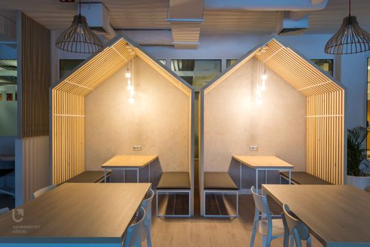 Kolejna część także przystosowana jest do nauki. Można tu przysiąść na krześle przy jednym ze stolików lub – jeśli zajdzie taka potrzeba - bardziej się odizolować w poprzedzielanych ściankami boksach. Każdy wyposażony jest w minibiurko na laptopa. Popracować można również w kilku osobnych, dających poczucie większej prywatności, drewnianych „domkach”. To idealne miejsce na pracę w niewielkich zespołach.