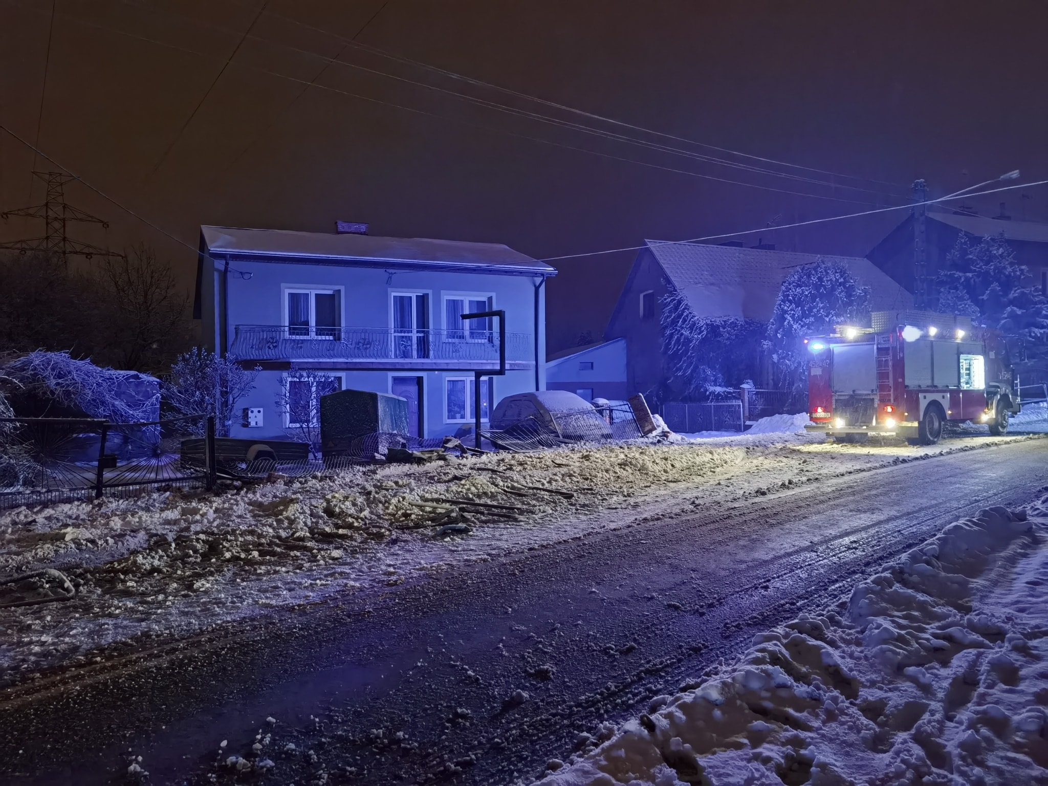 Działania strażaków polegały na zabezpieczeniu miejsca zdarzenia, odłączeniu klem akumulatora w pojeździe oraz zebraniu wyciekającego paliwa do 3 zbiorników zastępczych. Rozlane paliwo z jezdni uprzątnięto za pomocą sorbentu. Zadysponowana została również odśnieżarka w celu posypania śliskiej jezdni. Zniszczonym słupem zajęli się pracownicy pogotowia energetycznego. Po upewnieniu się, że uszkodzony bak został całkowicie opróżniony z paliwa zakończono działania.