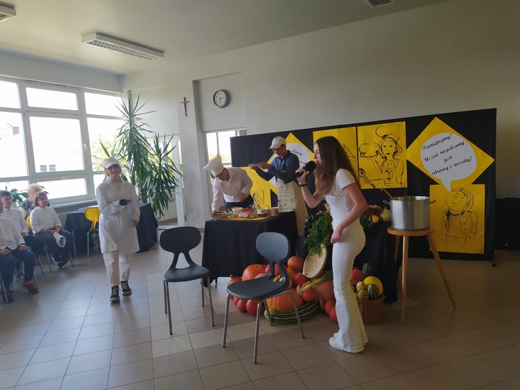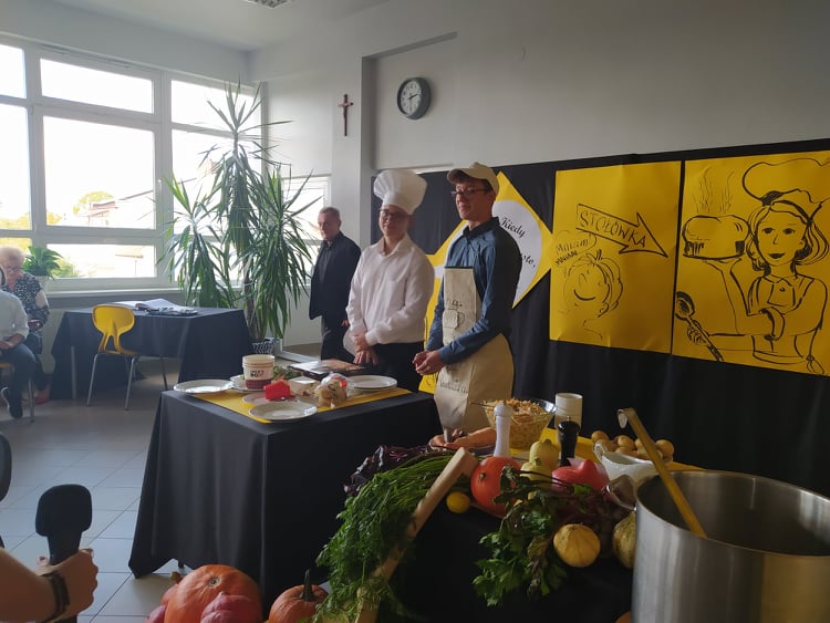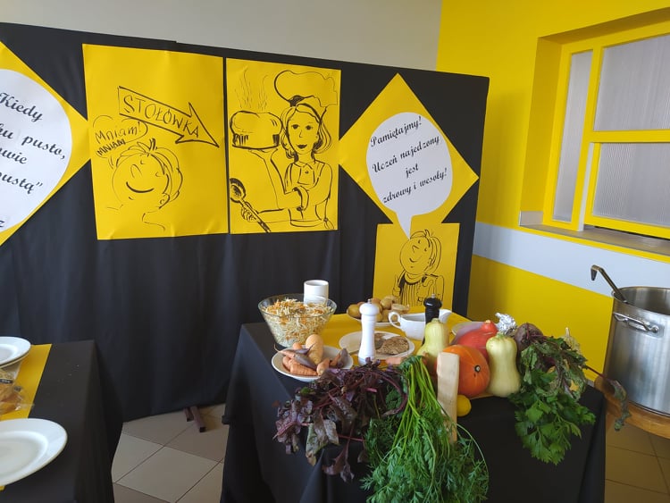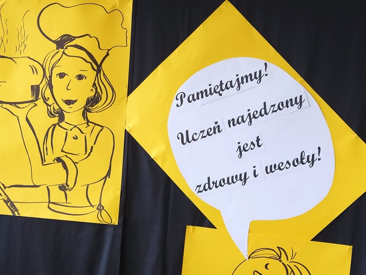 W szkolnej stołówce dzieci jedzą dwudaniowe obiady. Codziennie gotowanych jest około 200 posiłków. Część z nich dowożona jest do szkoły podstawowej w Wymysłowie.
