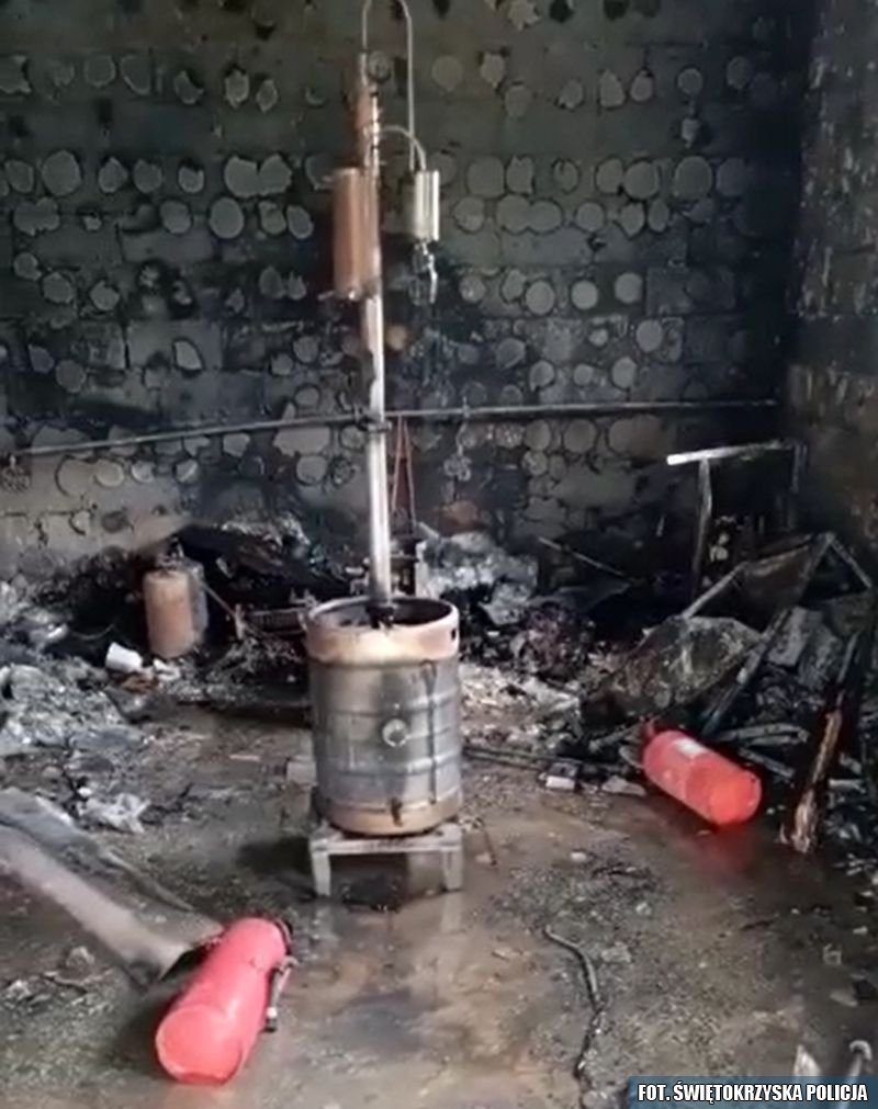 W trakcie oględzin prowadzonych po akcji gaśniczej, w spalonym pomieszczeniu gospodarczym funkcjonariusze ujawnili 5 beczek z zacierem oraz aparaturę do destylacji alkoholu.