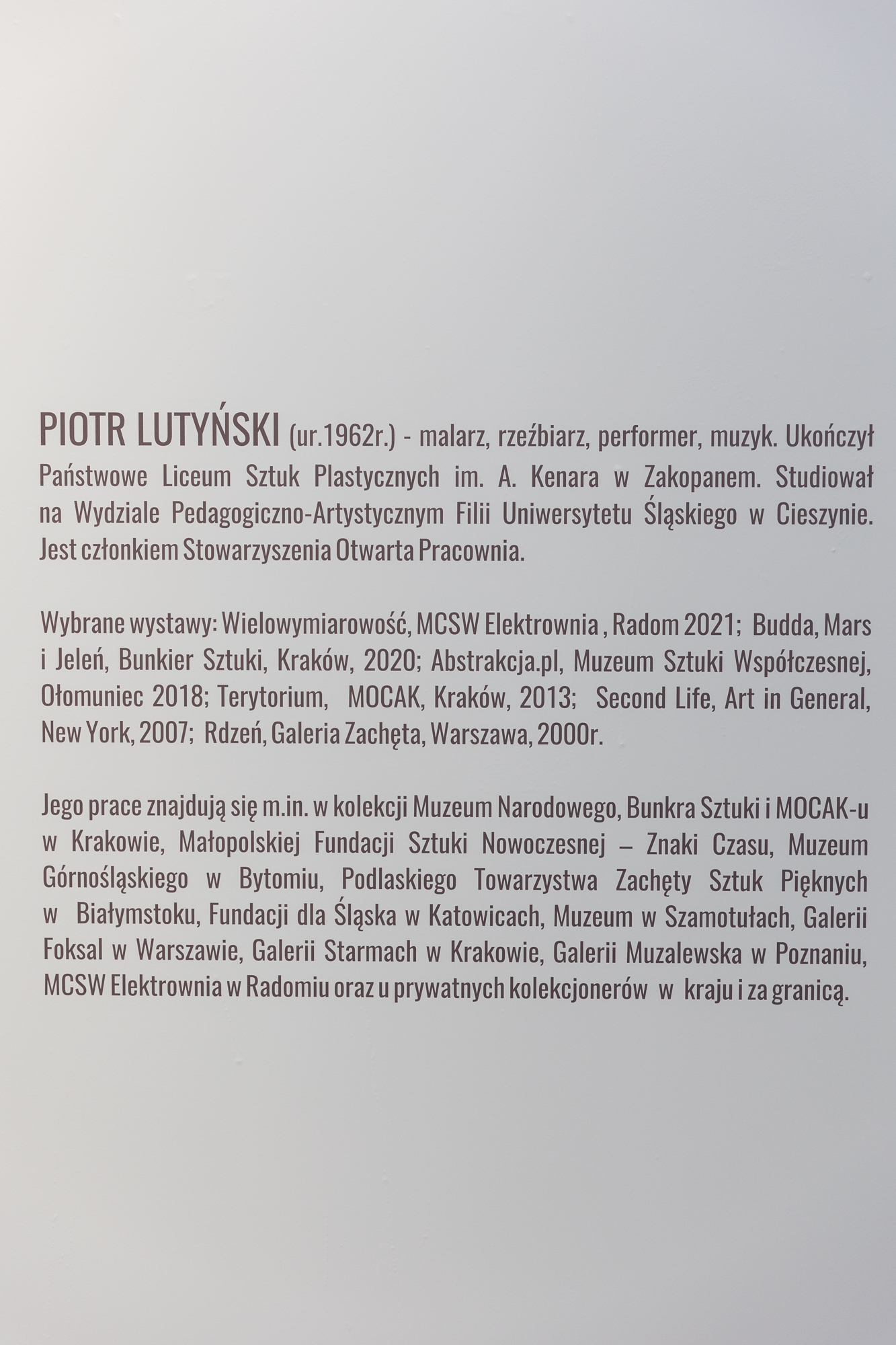 Piotr Lutyński – urodzony w 1962 roku w Tychach. Ukończył Państwowe Liceum Sztuk Plastycznych im. A. Kenara w Zakopanem. Studiował na Uniwersytecie Śląskim w Cieszynie, dyplom w 1990 roku w pracowni grafiki prof. Eugeniusza Delekty. Zajmuje się rzeźbą , malarstwem, wykonuje obiekty, instalacje, performance, koncerty muzyki eksperymentalnej, pokazy multimedialne. Współzałożyciel (z Markiem Kozicą) grupy – zespołu muzyki improwizowanej RDZEŃ oraz twórca RDZEŃ2 (koncerty z Ryszardem Krynickim). Prowadzi akcje totalne w przestrzeni miast polegające na interdyscyplinarnym koncercie połączonym z akcją artystyczną (PROJEKT KR 736EJ Autobus-Galeria-Pracownia). Jego prace znajdują się m.in. w kolekcji Muzeum Narodowego w Krakowie, Bunkra Sztuki, MOCAK-u w Krakowie, Małopolskiej Fundacji Sztuki Nowoczesnej – Znaki Czasu, Muzeum Górnośląskiego w Bytomiu, Podlaskiego Towarzystwa Zachęty Sztuk Pięknych w Białymstoku, Fundacji dla Śląska w Katowicach, Muzeum w Szamotułach, Galerii Foksal w Warszawie oraz u prywatnych kolekcjonerów w kraju i za granicą. Jest członkiem Stowarzyszenia Otwarta Pracownia. Mieszka i pracuje w Krakowie.