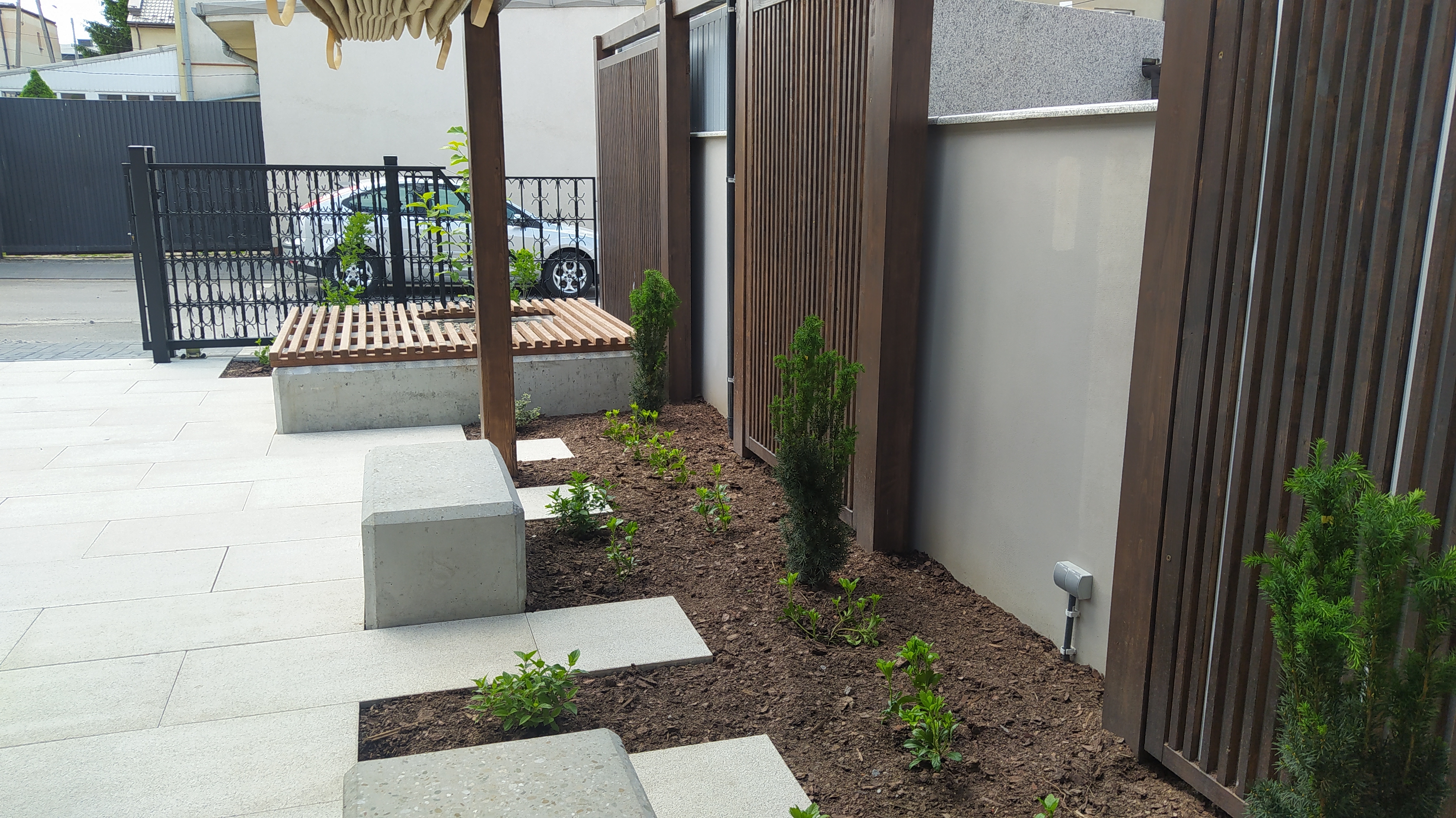 Miejsce jest zadaszone, z ustawionymi ławkami, obsadzone roślinami.