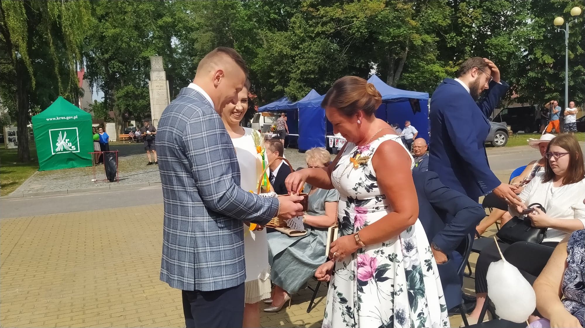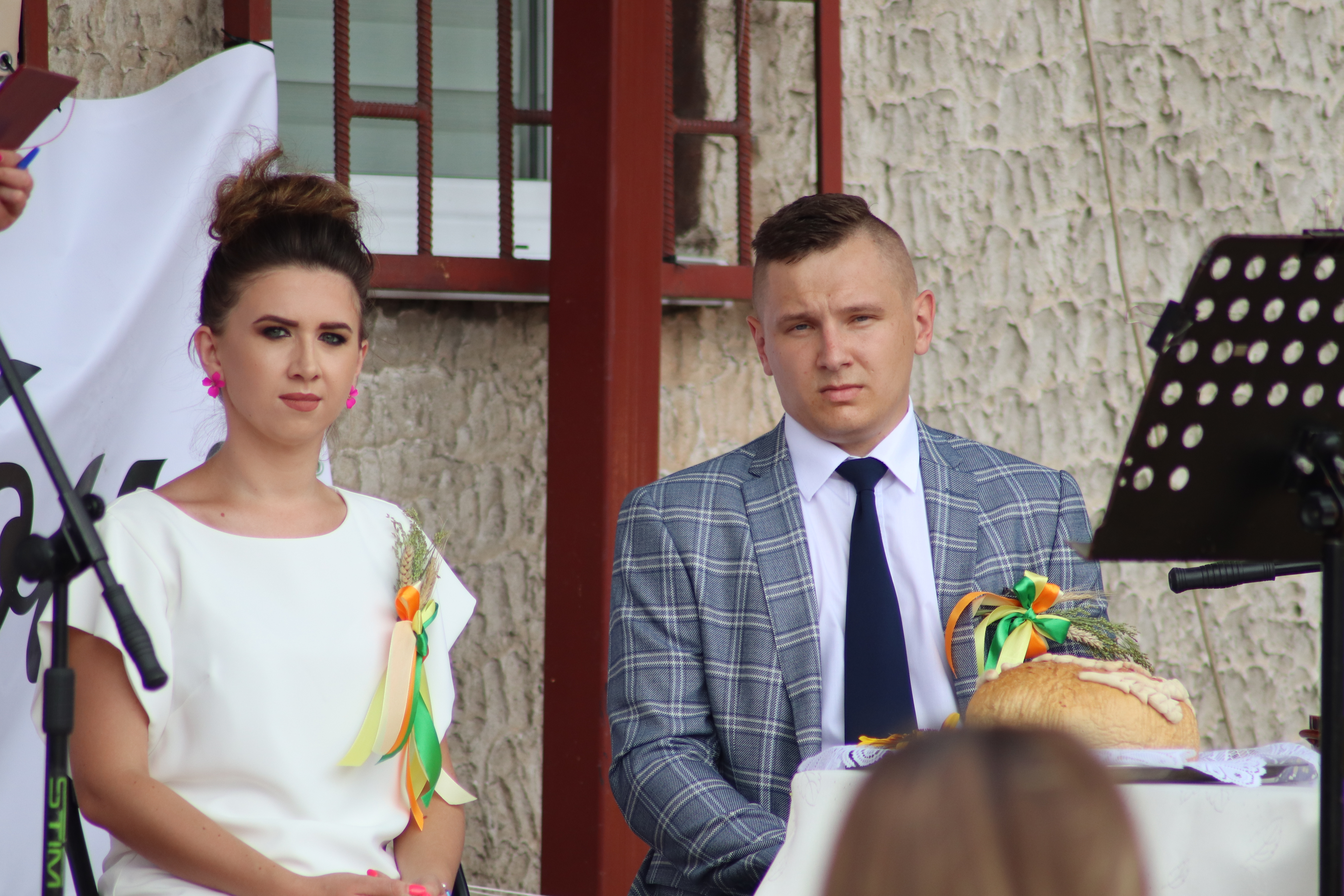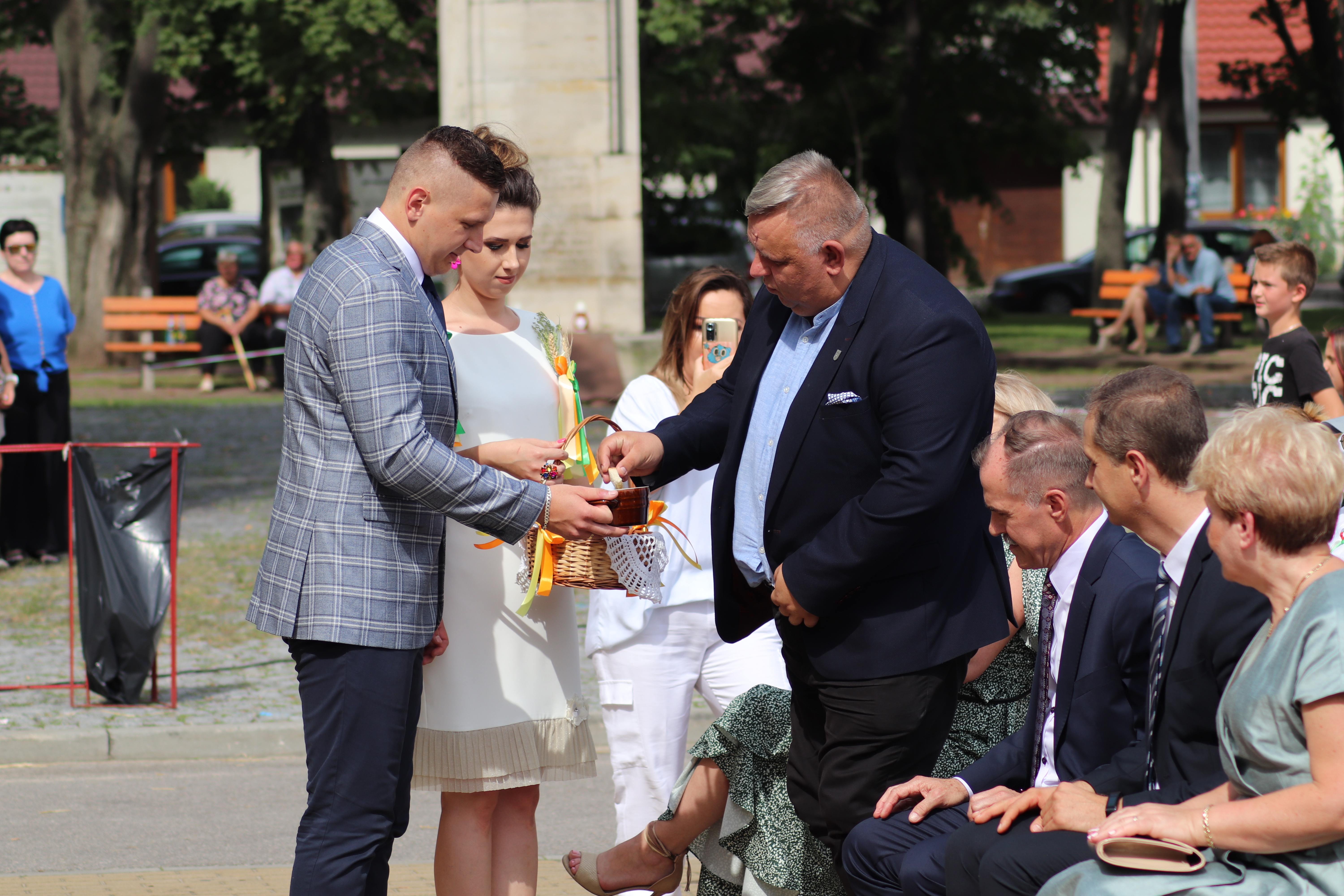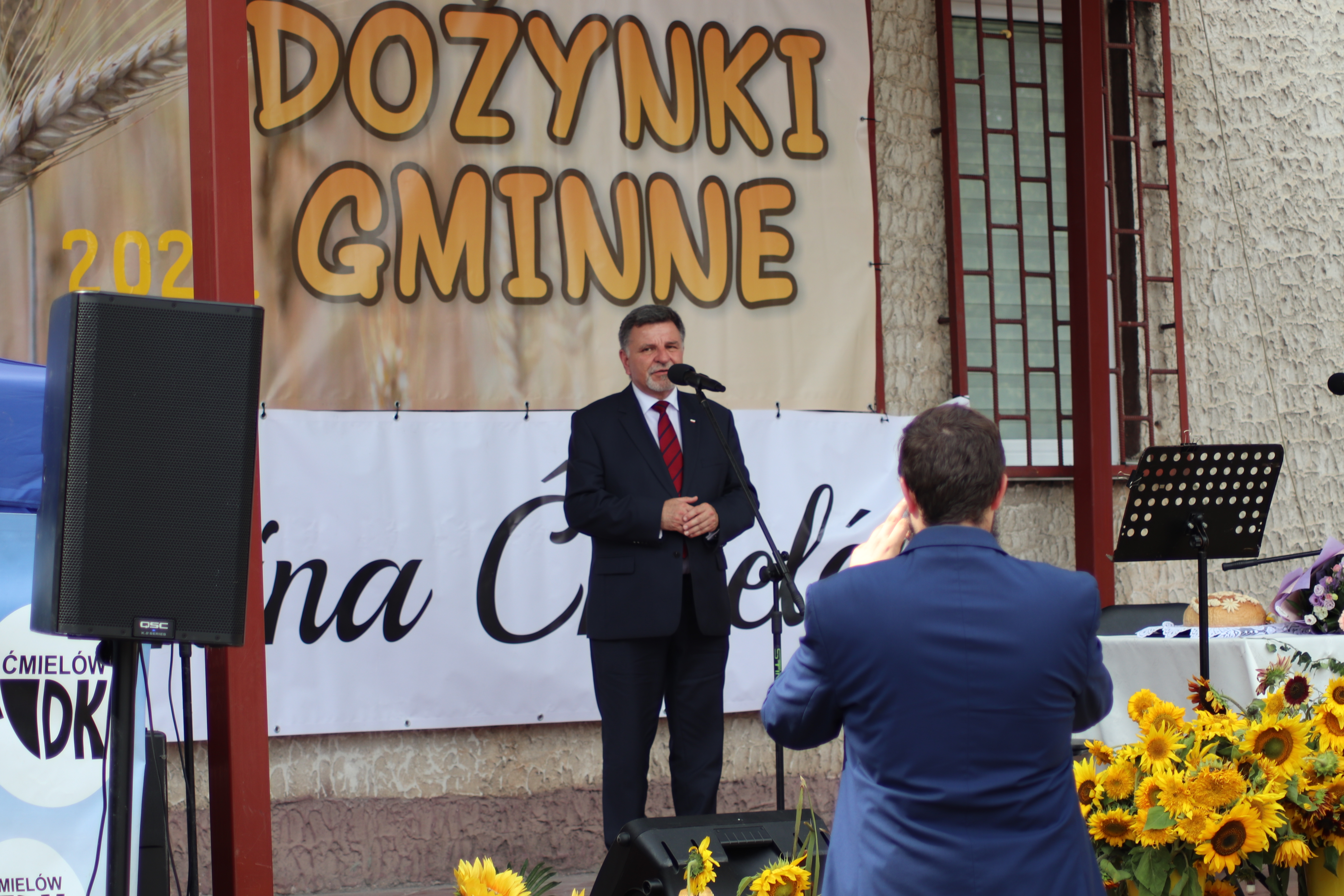 Starostowie dożynek: Angelika i Michał Rdzonek z Wiktoryna przekazali gospodarz gminy bochen chleba, wypieczony z tegorocznych zbóż. Burmistrz Joanna Suska podziękowała rolnikom za ich trud, pracę na polu, w sadzie i ogrodzie. Przyrzekła, że będzie tak rządziła, by chleba nie zabrakło na żadnym stole w gminie Ćmielów. Następnie starostowie dożynek częstowali gości chlebem i miodem.