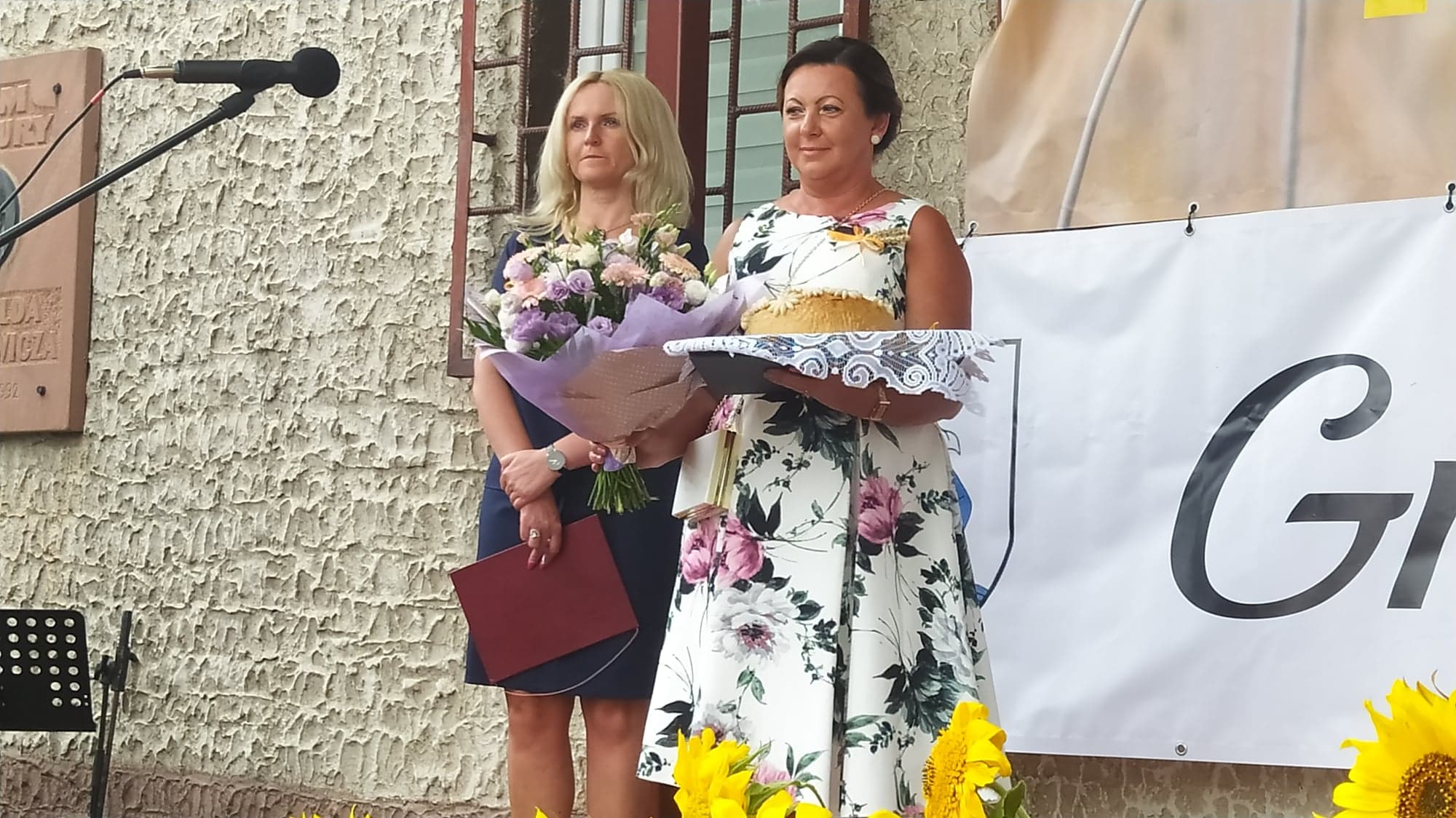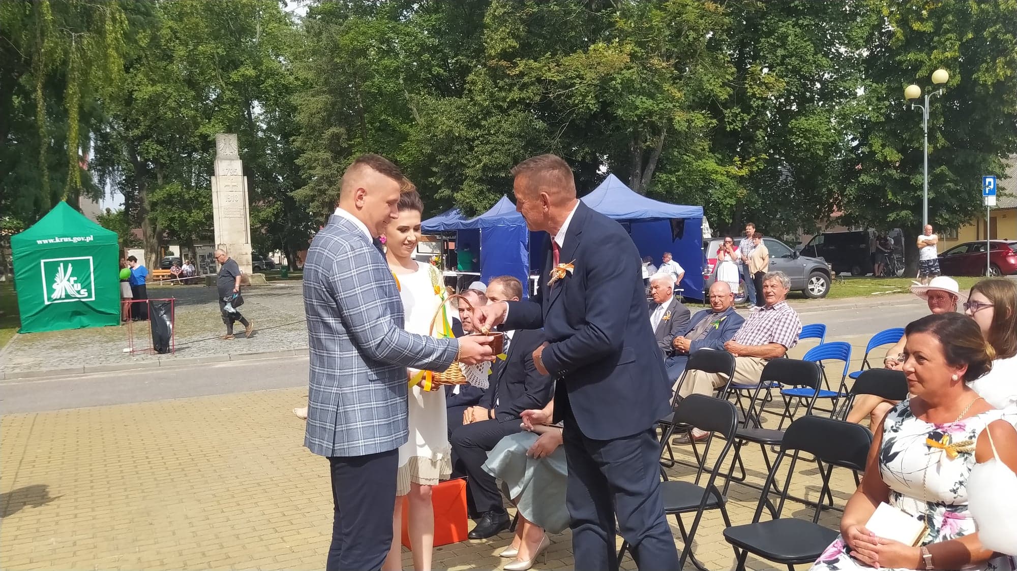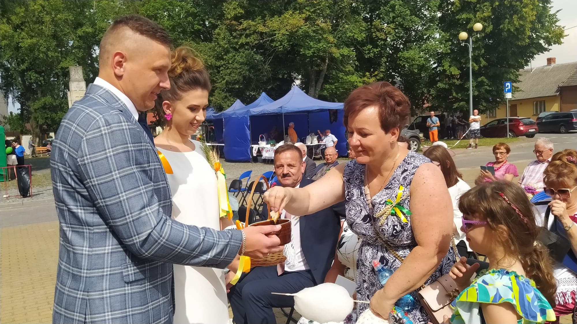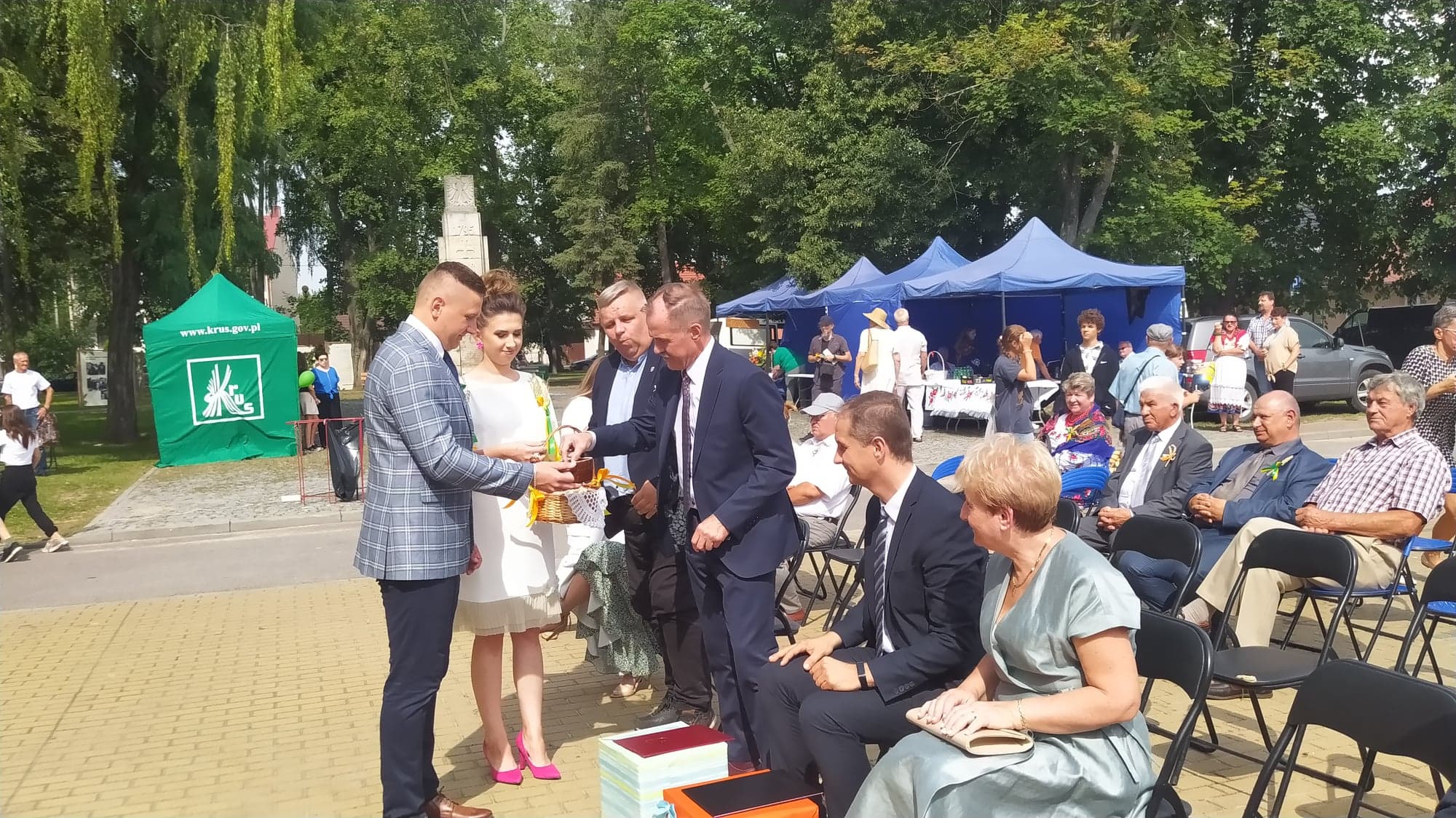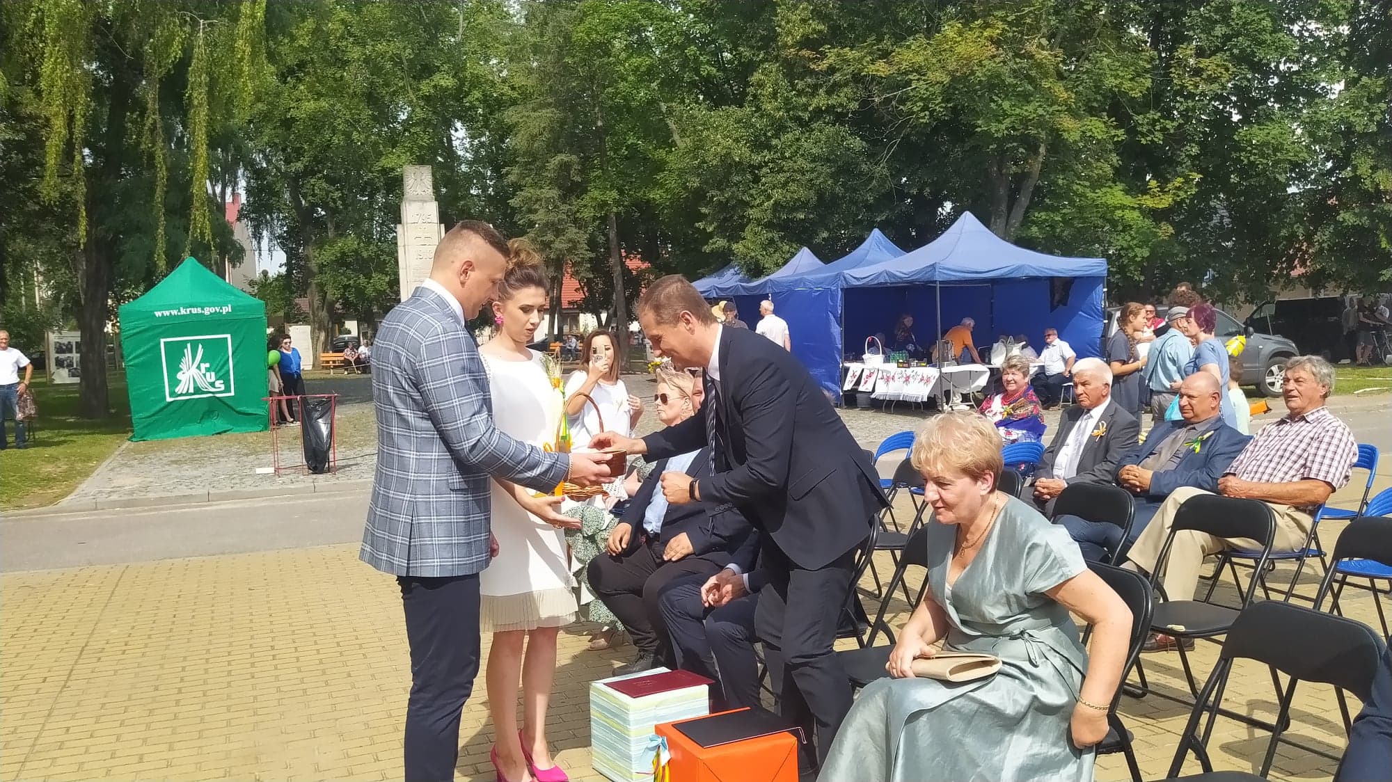 Starostowie dożynek: Angelika i Michał Rdzonek z Wiktoryna przekazali gospodarz gminy bochen chleba, wypieczony z tegorocznych zbóż. Burmistrz Joanna Suska podziękowała rolnikom za ich trud, pracę na polu, w sadzie i ogrodzie. Przyrzekła, że będzie tak rządziła, by chleba nie zabrakło na żadnym stole w gminie Ćmielów. Następnie starostowie dożynek częstowali gości chlebem i miodem.