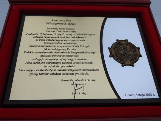Z okazji tak pięknego jubileuszu otrzymał życzenia i gratulacje od burmistrza Kunowa, Lecha Łodeja, radnej z Dołów Biskupich - Marii Pająk. O podziękowaniach nie zapomnieli druhowie z OSP w Dołach Biskupich.