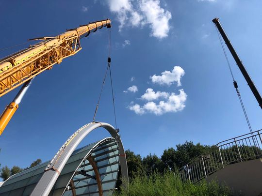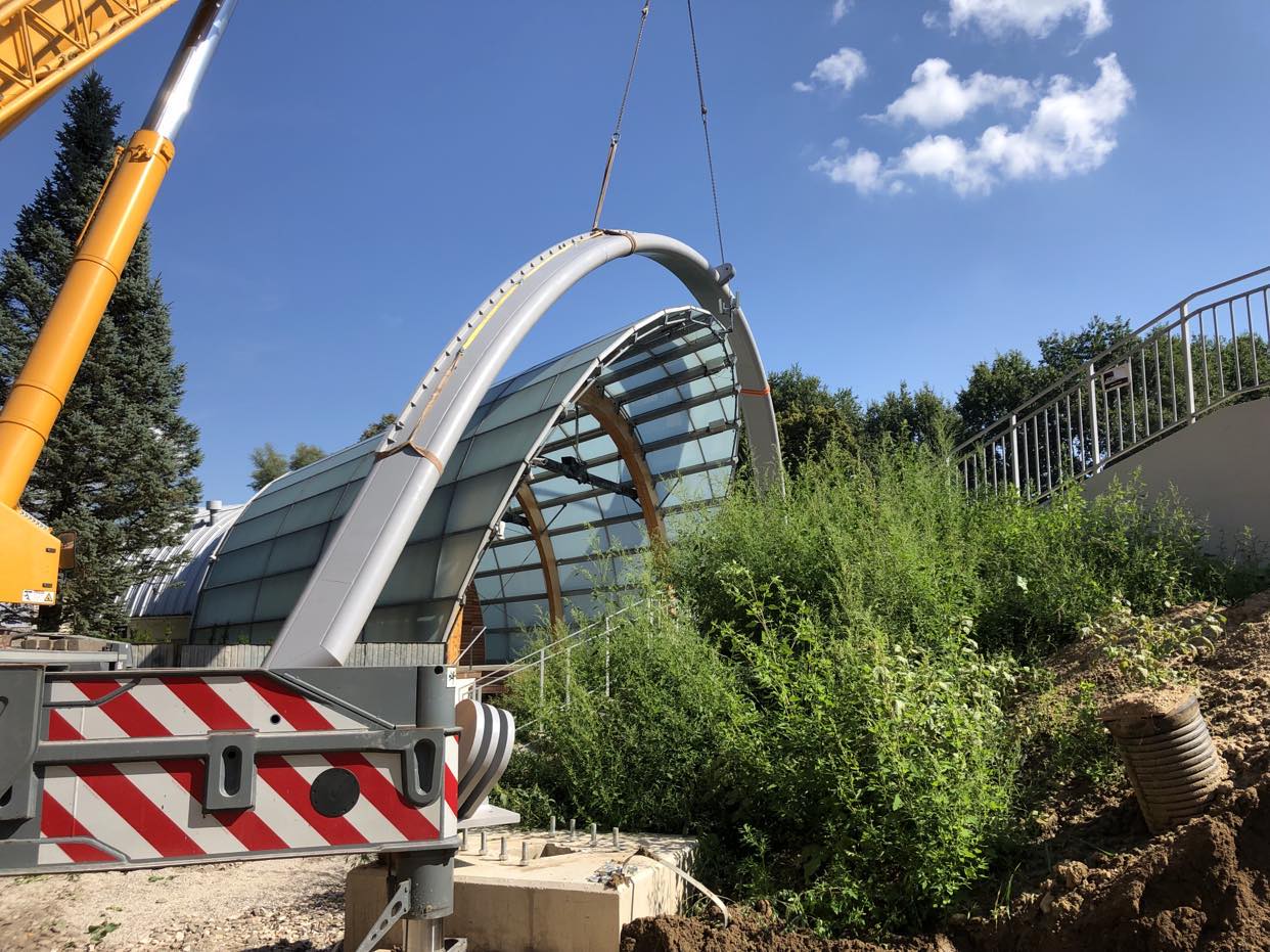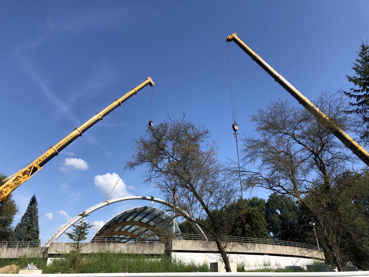 Stalowe łuki, na których wsparty będzie dach przyjechały w elementach. Na miejscu były scalane