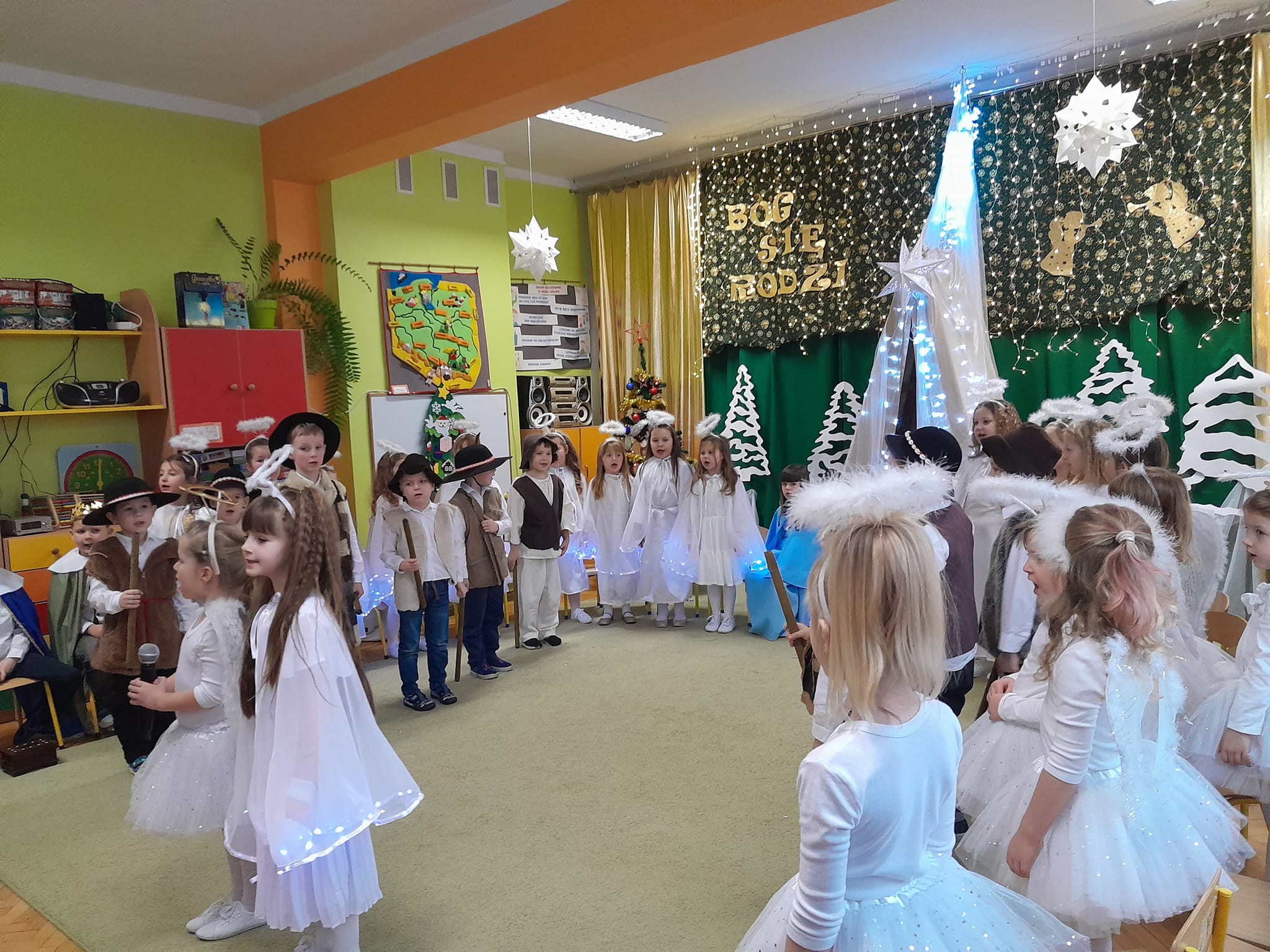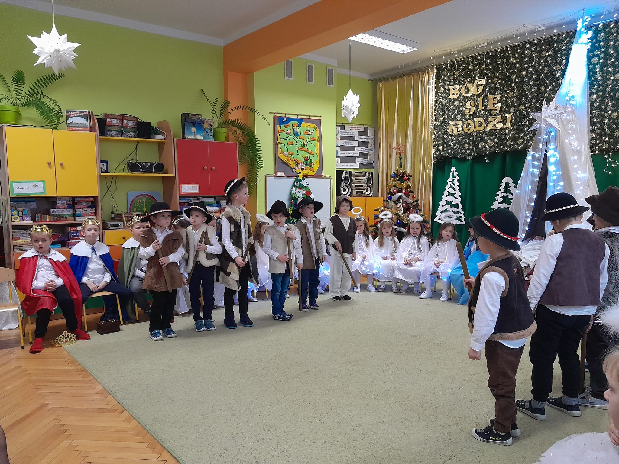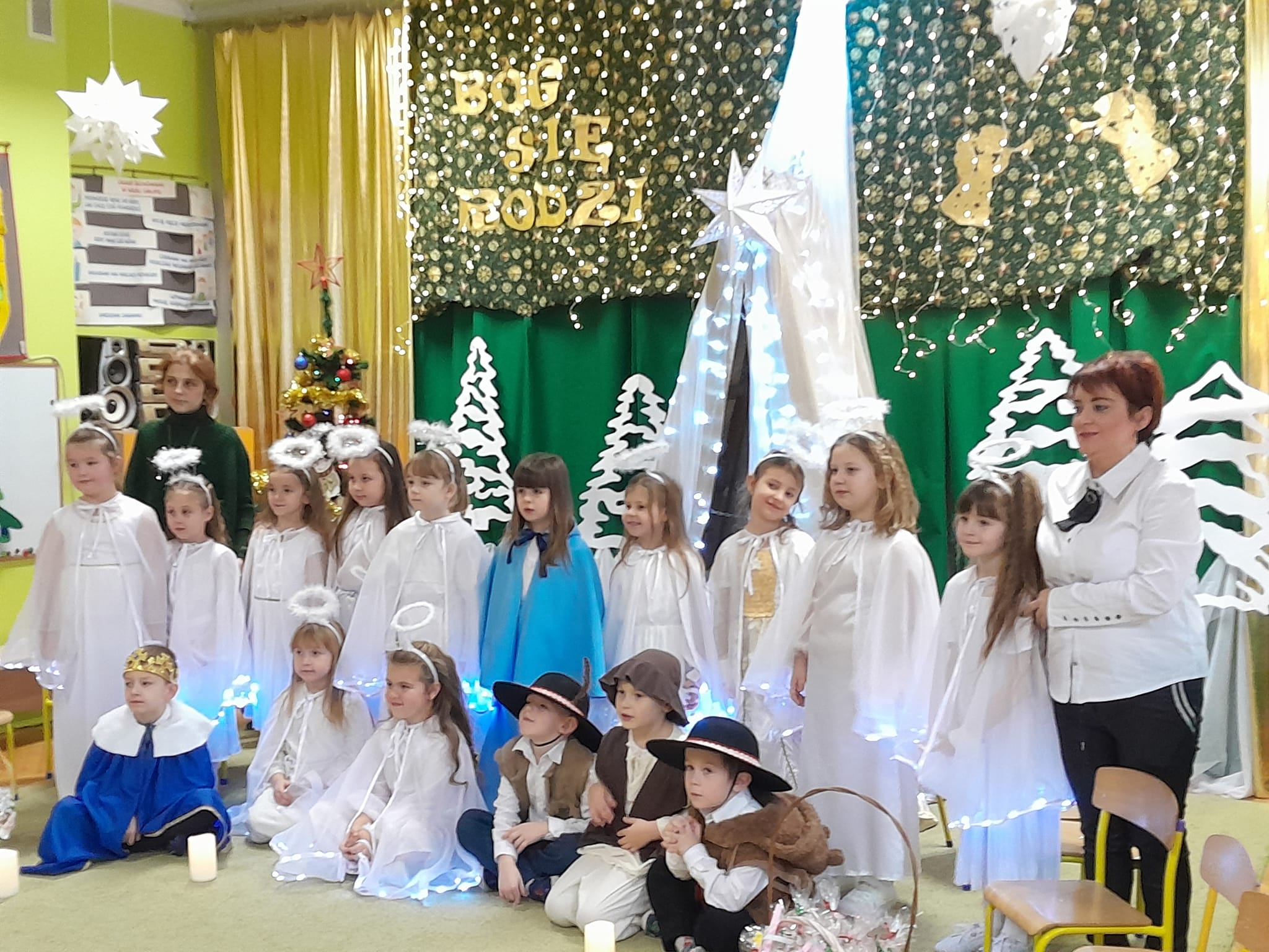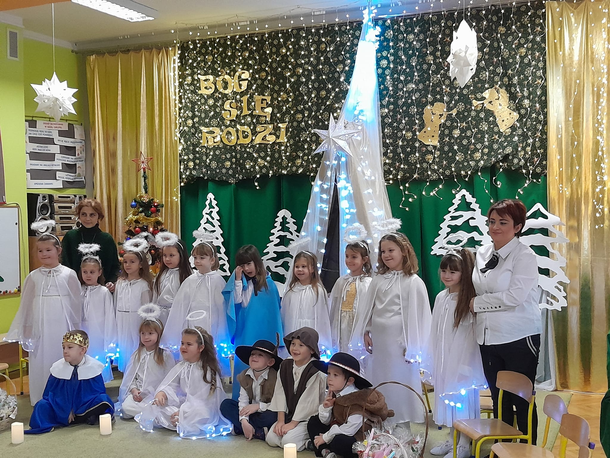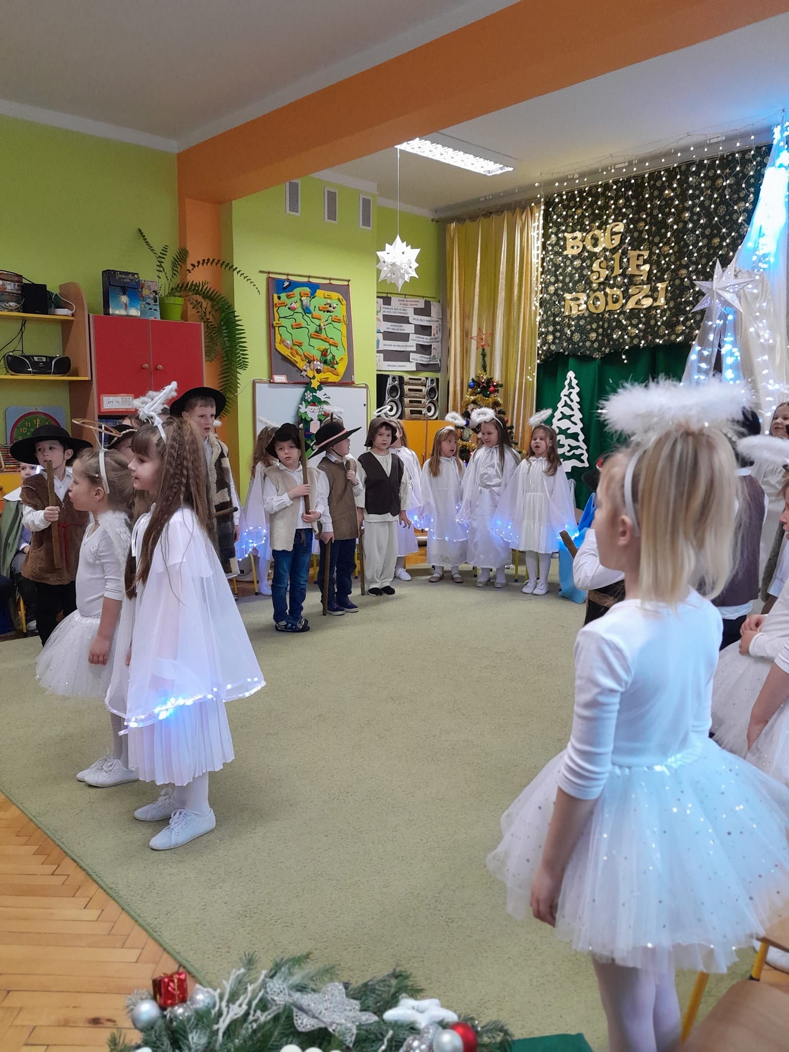 Przedstawienie bożonarodzeniowe w wykonaniu dzieci 5 i 6-cio letnich z grupy IV "Pszczółki" i grupy V "Motylki" obejrzeli rodzice oraz zaproszeni goście.