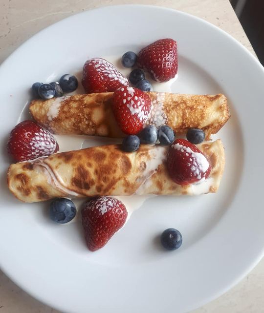 Kiedy naleśniki będą gotowe możemy je przełożyć ulubioną konfiturą lub posmarować serem i dodać owoce. Na koniec możemy polać śmietaną kremówką. SMACZNEGO.