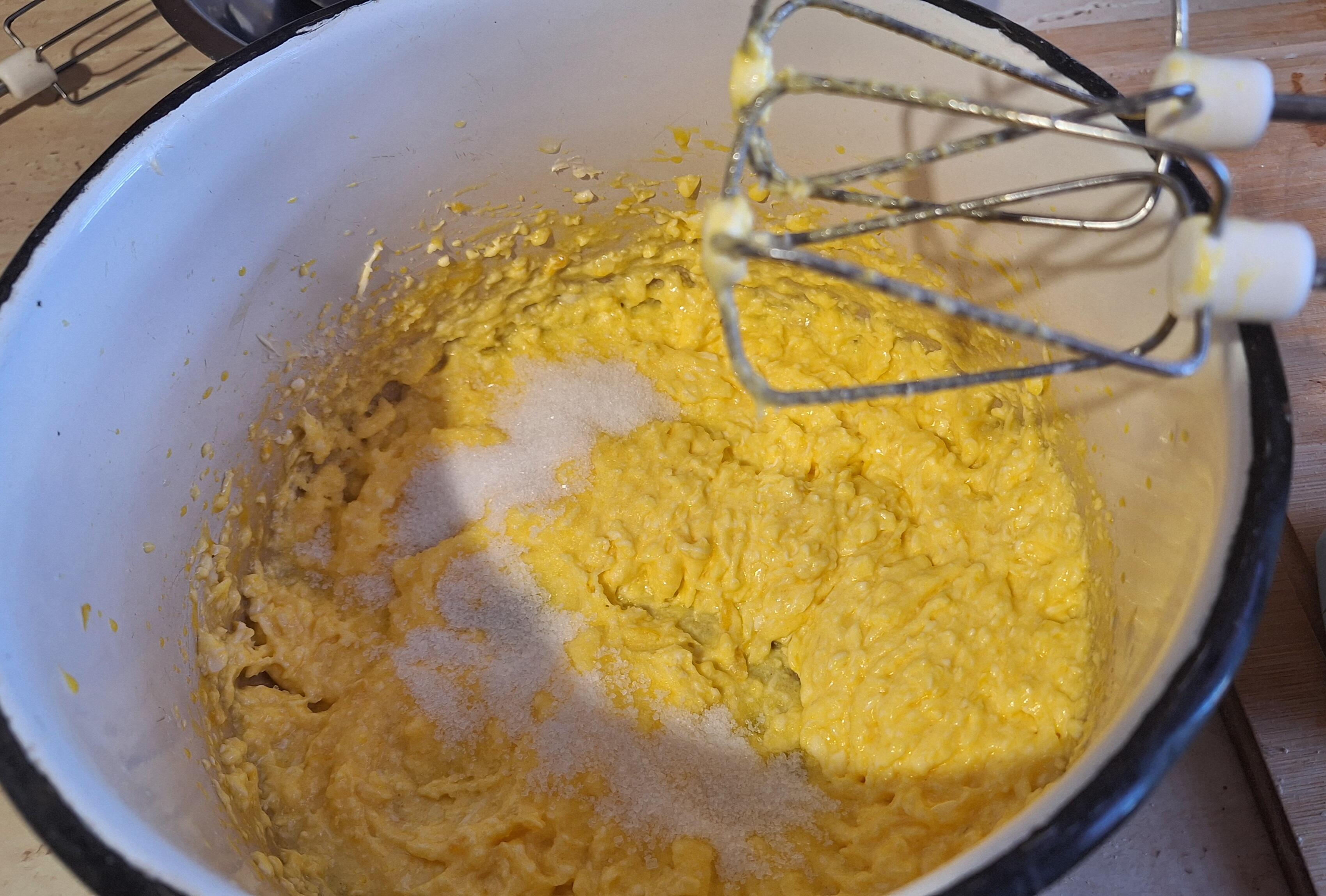Miękkie masło ubijamy z cukrem pudrem, cukrem wanilinowym oraz skórką z cytryny na puszysty biały krem. Cały czas cierpliwie ubijamy i dodajemy po jednym żółtku.