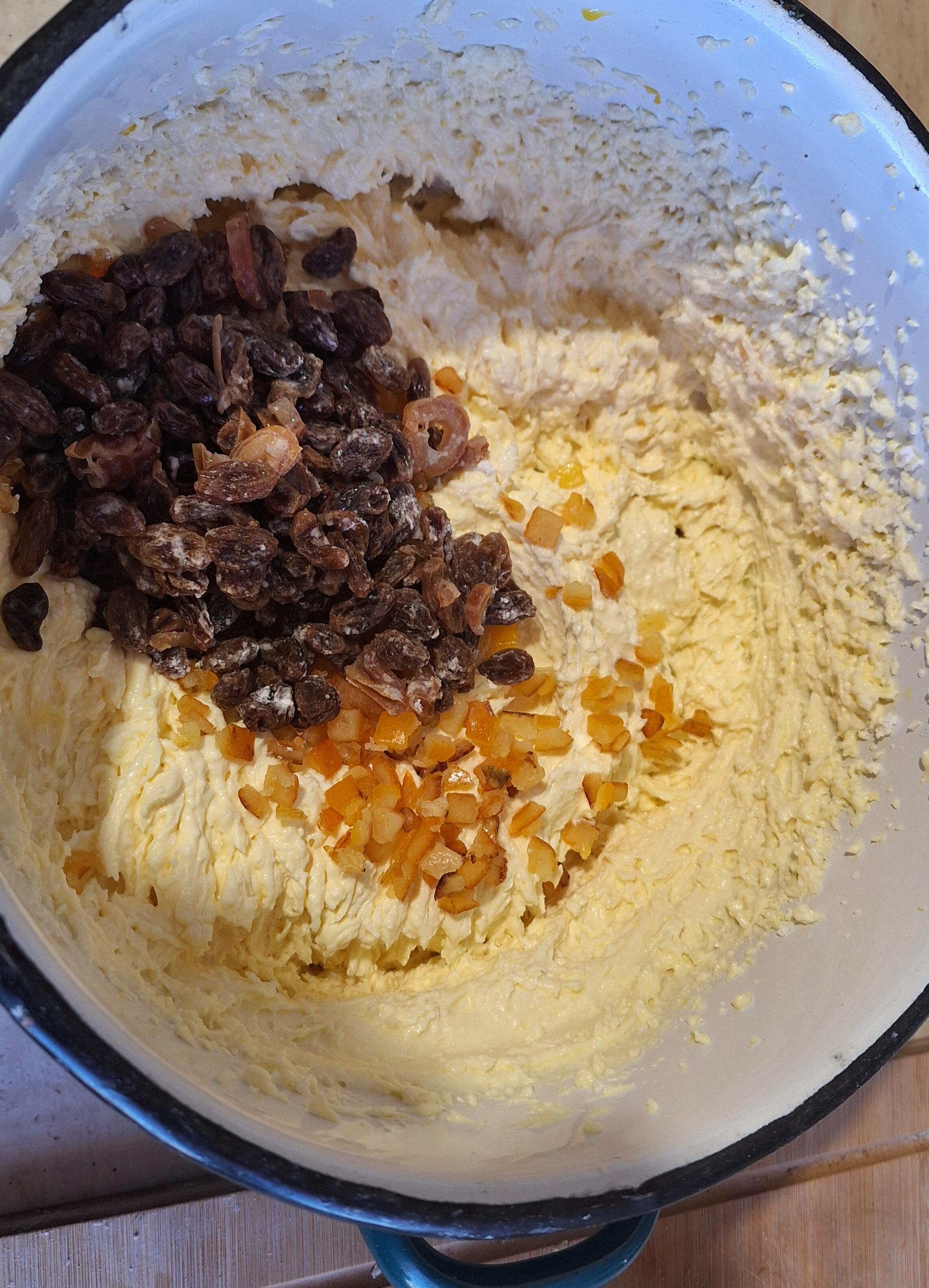 Następnie dodajemy zmielony ser i miksujemy na jednolitą masę. Dodajemy smażoną skórkę pomarańczową, posiekane orzechy lub migdały i posiekane figi lub morele oraz rodzynki Wszystko delikatnie mieszamy.