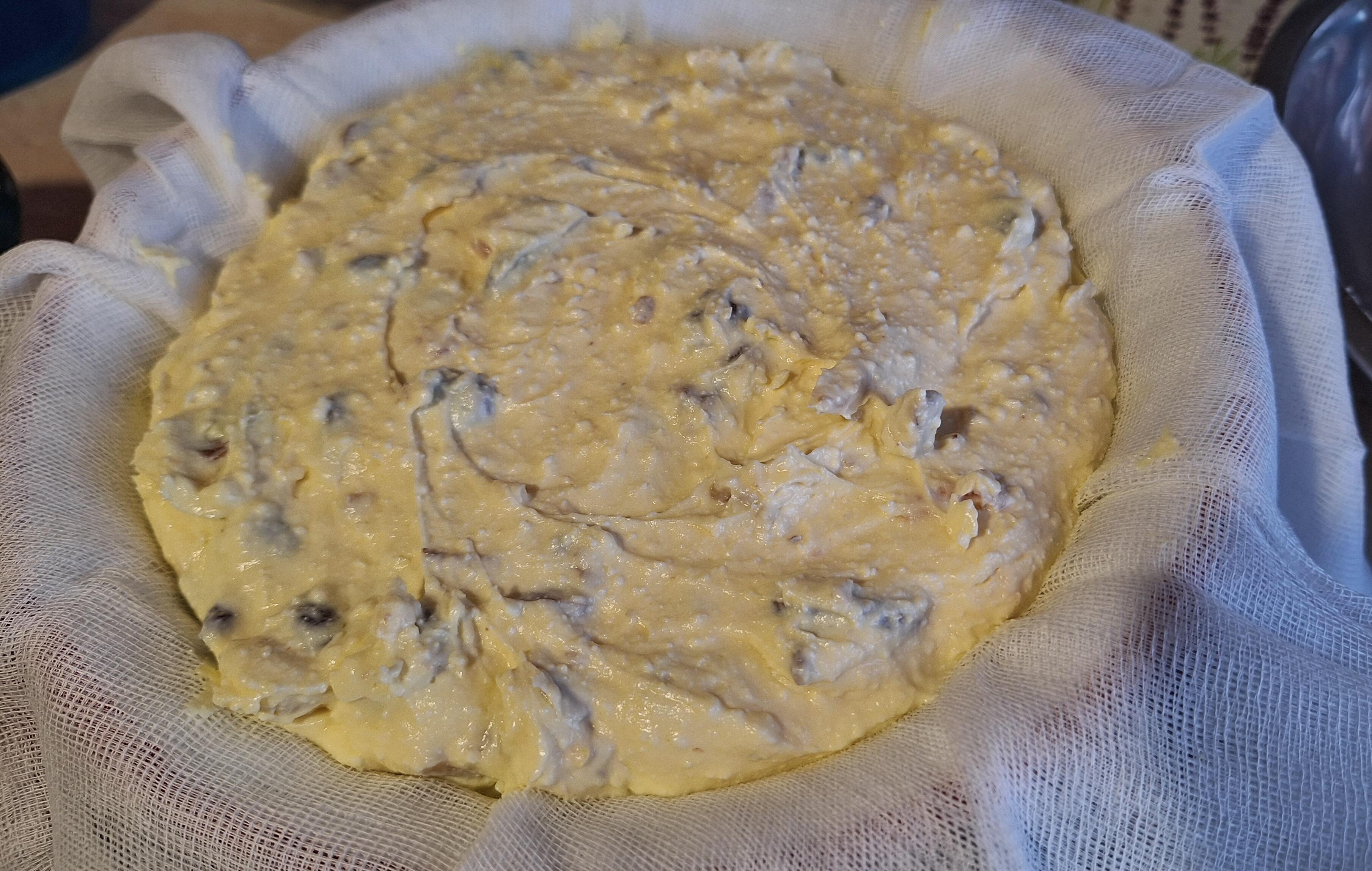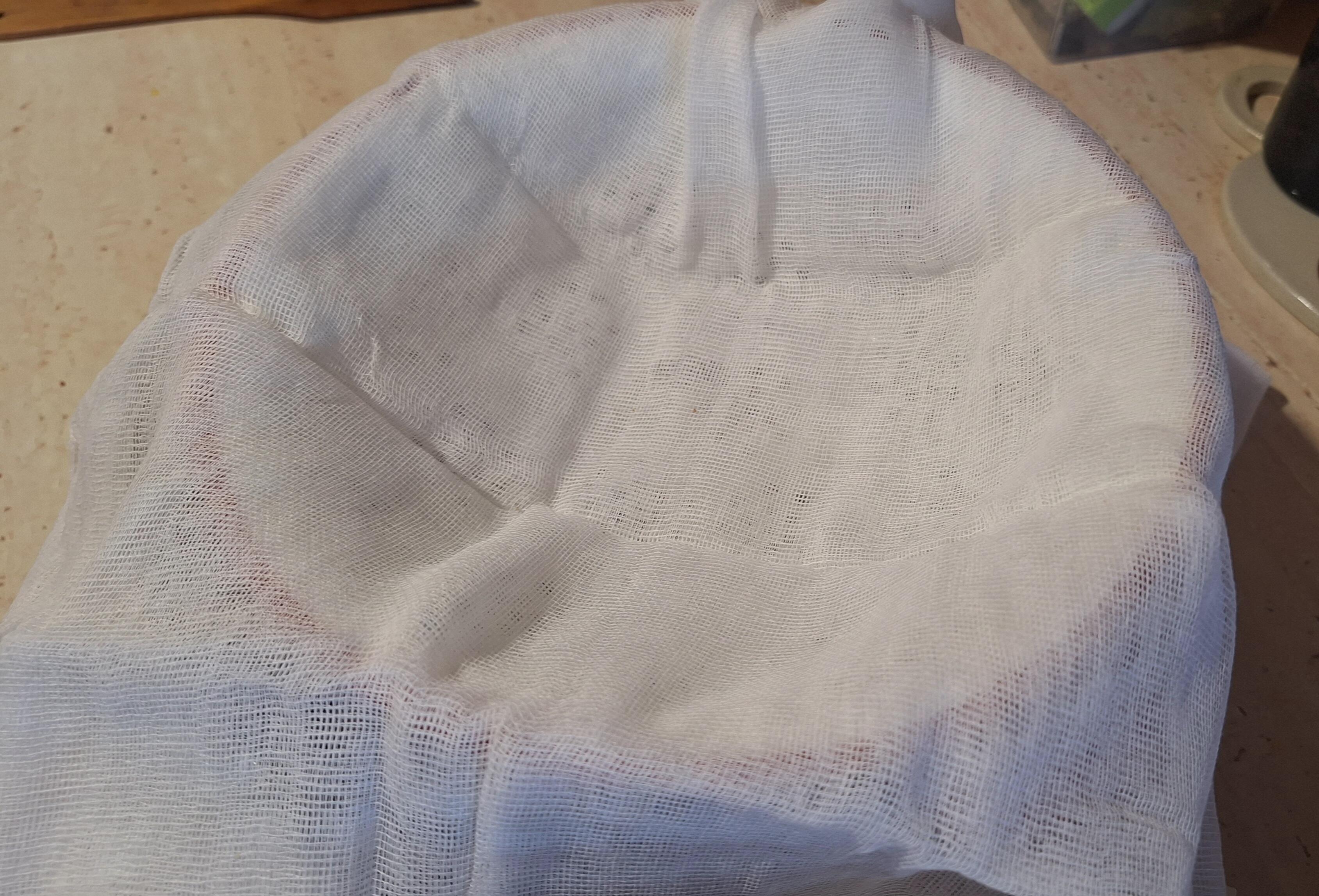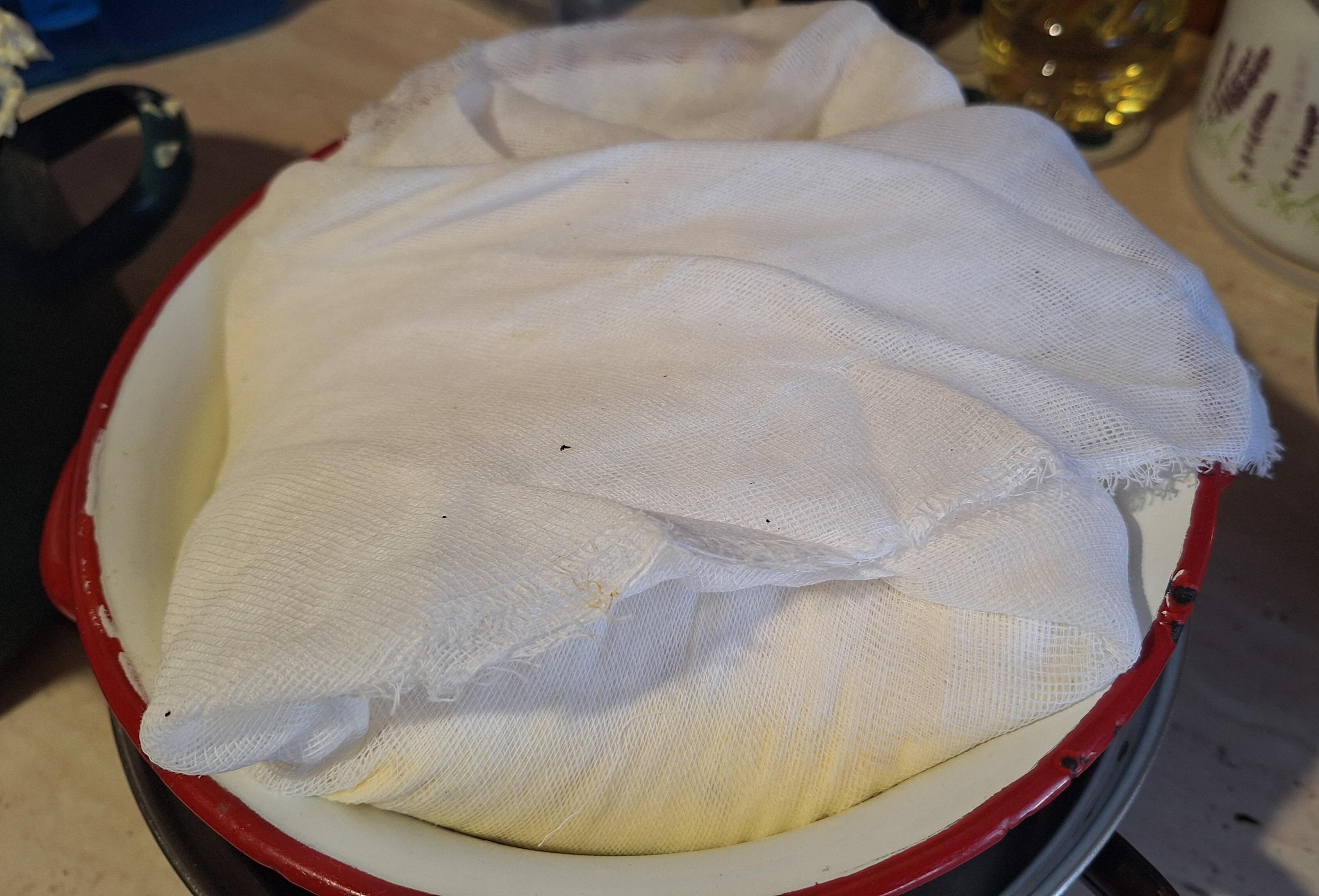 Ustawiamy duże sito (min. 20 cm średnicy) na misce. Sito wyścielamy podwójnie złożoną gazą. Wykładamy do niego masę serową, zawijamy wystające brzegi gazy na wierzch. Przykrywamy talerzykiem i obciążamy.