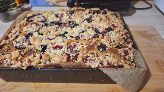 Po tym czasie mieszamy składniki i przekładamy ciasto do przygotowanej wcześniej foremki. Na wierzch wykładamy owoce i posypujemy kruszonką. Wkładamy do piekarnika na 45 minut.