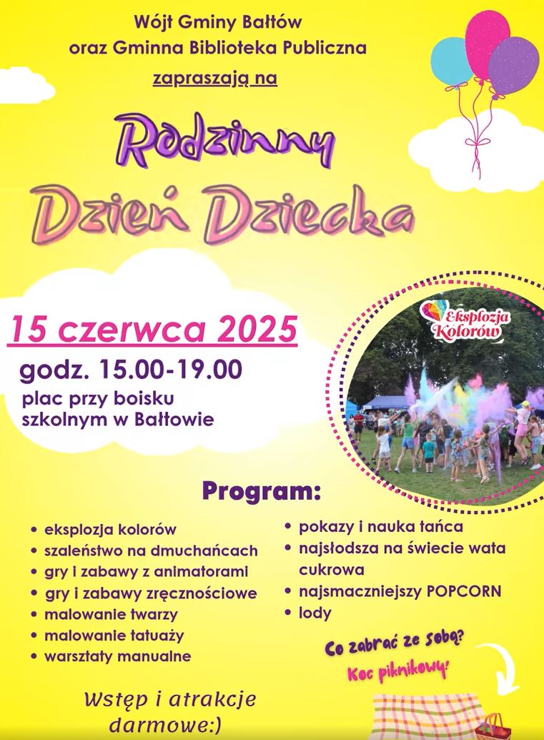 Rodzinny Dzień Dziecka zaplanowano na niedzielę 15 czerwca w Bałtowie, na placu przy boisku szkolnym. Tam dla najmłodszych będą czekały dmuchańce, gry i zabawy z animatorami, pokazy i nauka tańca, będzie również Eksplozja Kolorów, nie zabraknie oczywiście słodkości. Wspólna zabawa rozpocznie się o godzinie 15:00 i potrwa do 19:00.