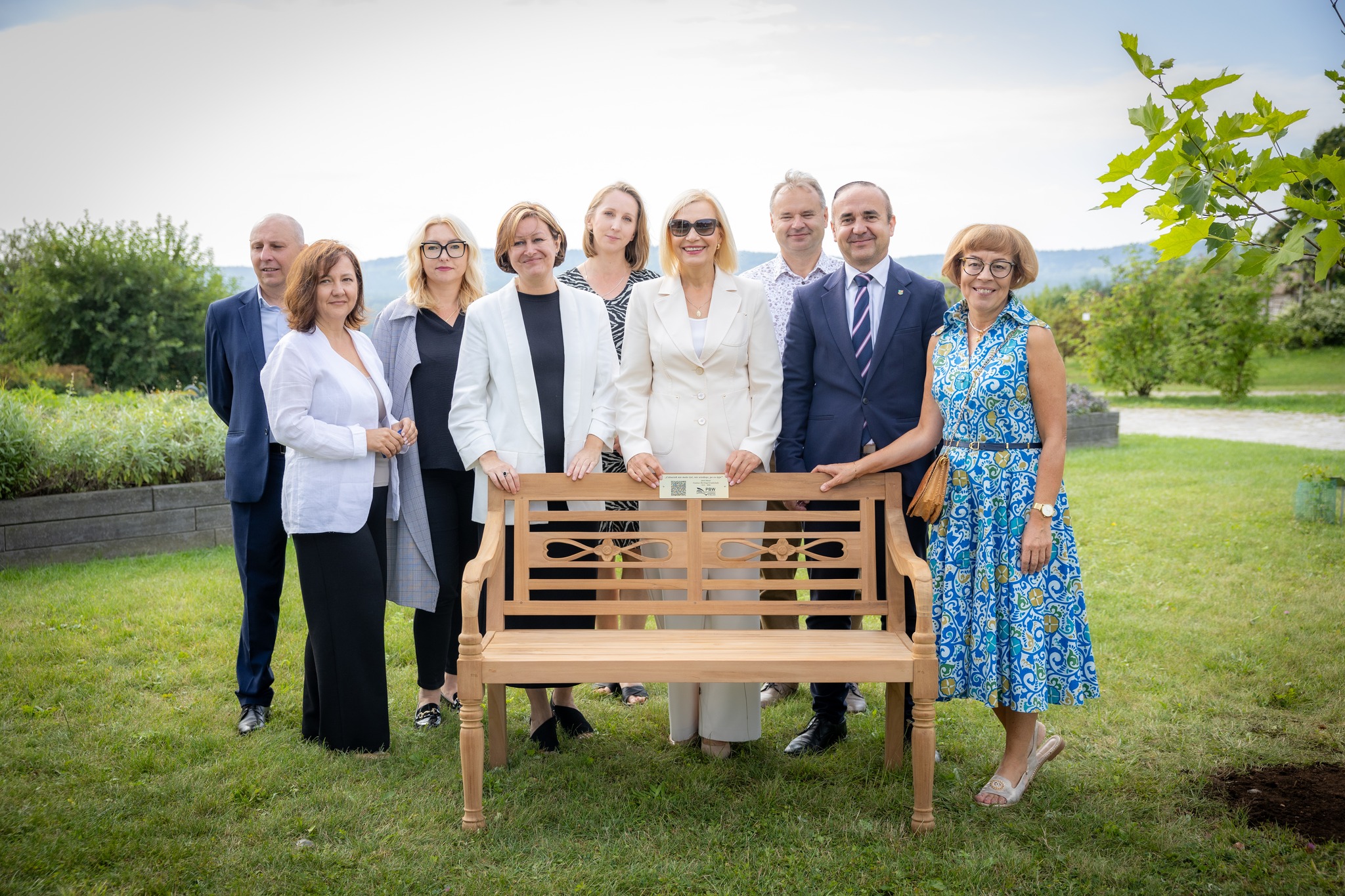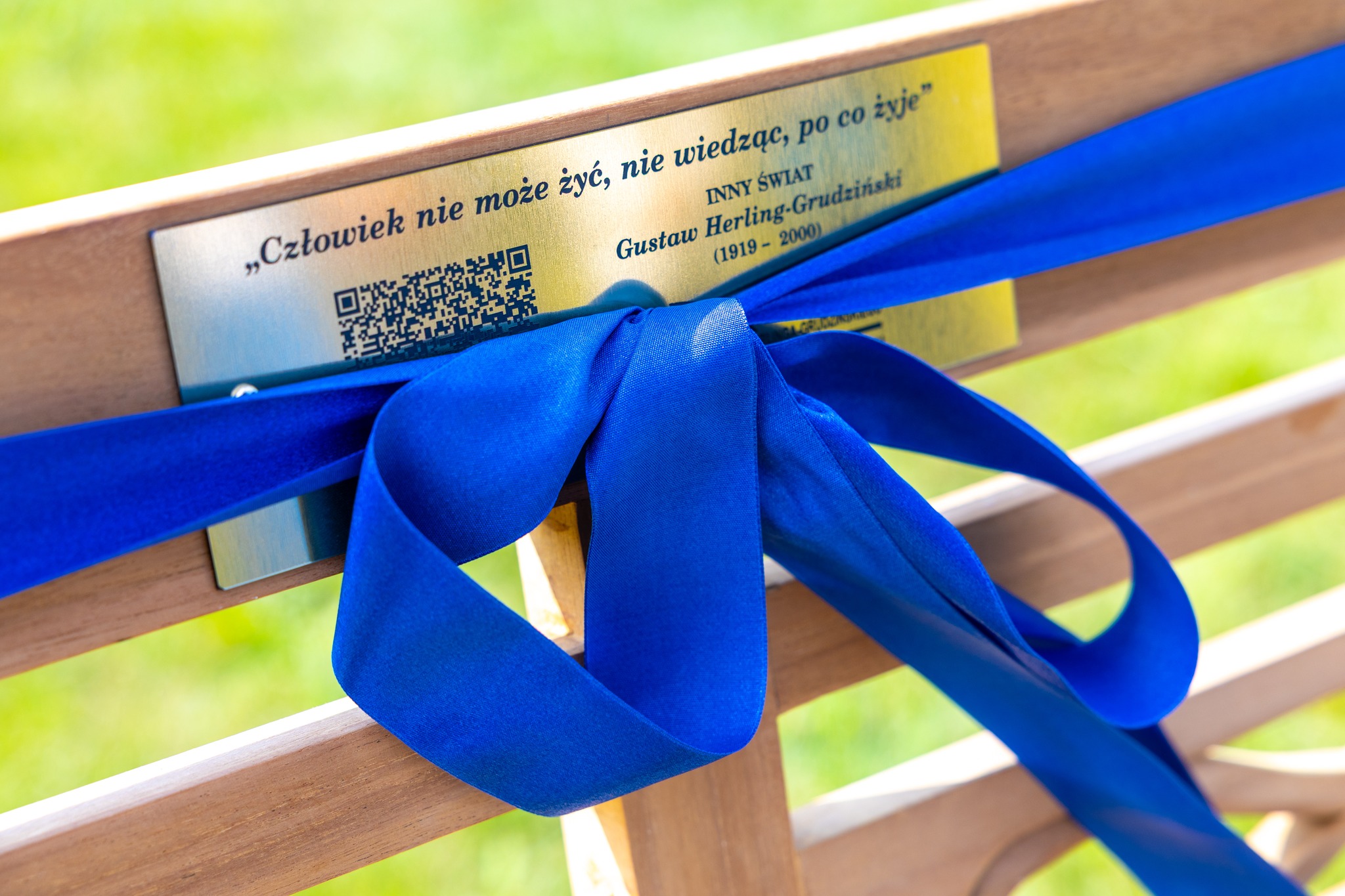 Obok platana odsłonięto symboliczną ławeczkę z tabliczką zawierającą kod QR, który przekierowuje na stronę internetową biblioteki.
