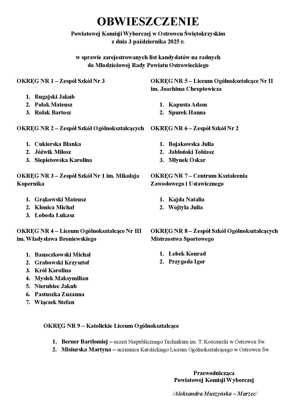 Okręg nr 9: Okręg otwarty, obejmujący osoby nie uczęszczające do szkół wymienionych w okręgach 1-8 – 2 mandaty