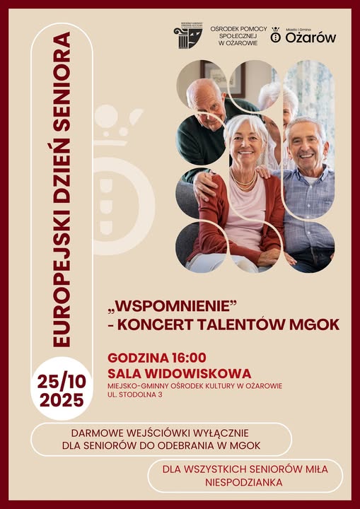 Europejski Dzień Seniora, będący okazją do celebracji życia i pasji osób starszych, zbliża się wielkimi krokami. 25 października 2025 roku w Miejskim Ośrodku Kultury w Ozarowie odbędzie się koncert talentów zatytułowany "Wspomnienie". Wydarzenie rozpocznie się o godzinie 16:00 w sali widowiskowej. To nie tylko szansa na zaprezentowanie umiejętności artystycznych seniorów, ale również moment integracji i wspólnego spędzenia czasu. Organizatorzy przewidują wiele nieszablonowych występów, które z pewnością dostarczą widzom niezapomnianych wrażeń. Darmowe wejściówki będą dostępne wyłącznie dla seniorów w Miejsko-Gminnym Ośrodku Kultury. Wszyscy uczestnicy wydarzenia mogą liczyć na miłe niespodzianki!