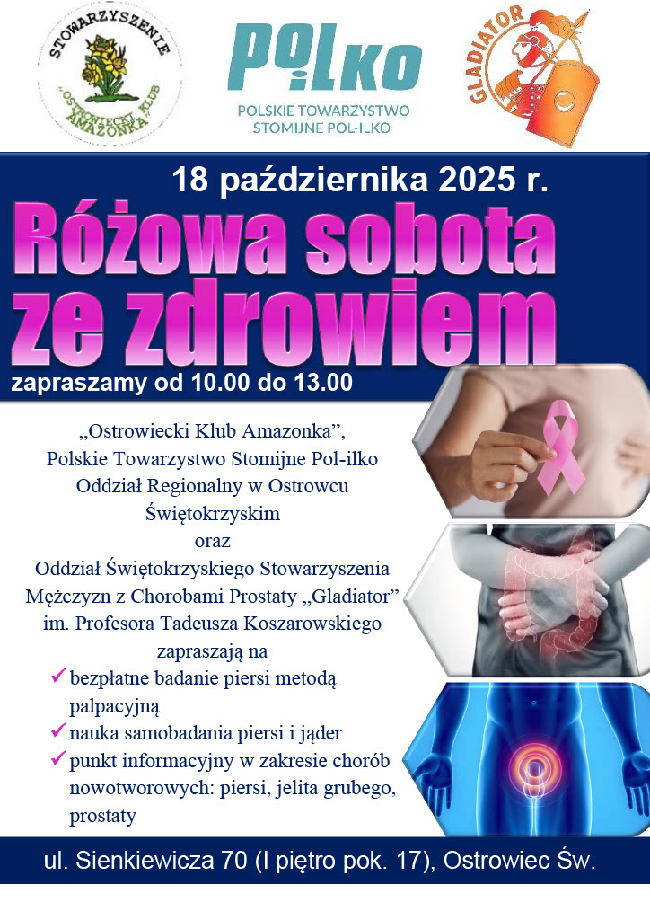 W sobotę, 18 października 2025 roku, w Ostrowcu Świętokrzyskim odbędzie się wydarzenie pod hasłem Różowa sobota ze zdrowiem. W ramach akcji, organizowanej przez Ostrowiecki Klub Amazonek oraz Polskie Towarzystwo Stomijne POL-ILKO, mieszkańcy będą mieli szansę na bezpłatne badania piersi metodą palpacyjną oraz naukę samobadania piersi i jąder. Dodatkowo, w punkcie informacyjnym specjaliści będą udzielać informacji na temat chorób nowotworowych, dotyczących piersi, jelita grubego i prostaty. To wyjątkowa okazja, by zadbać o swoje zdrowie i zdobyć wiedzę na temat profilaktyki nowotworowej. Wydarzenie odbędzie się pod adresem: ul. Sienkiewicza 70, I piętro pok. 17, Ostrowiec Św. Zważając na rosnące potrzeby zdrowotne społeczeństwa, taka inicjatywa może uratować wiele istnień, a wiedza na temat samobadania jest kluczowa w walce z chorobami.