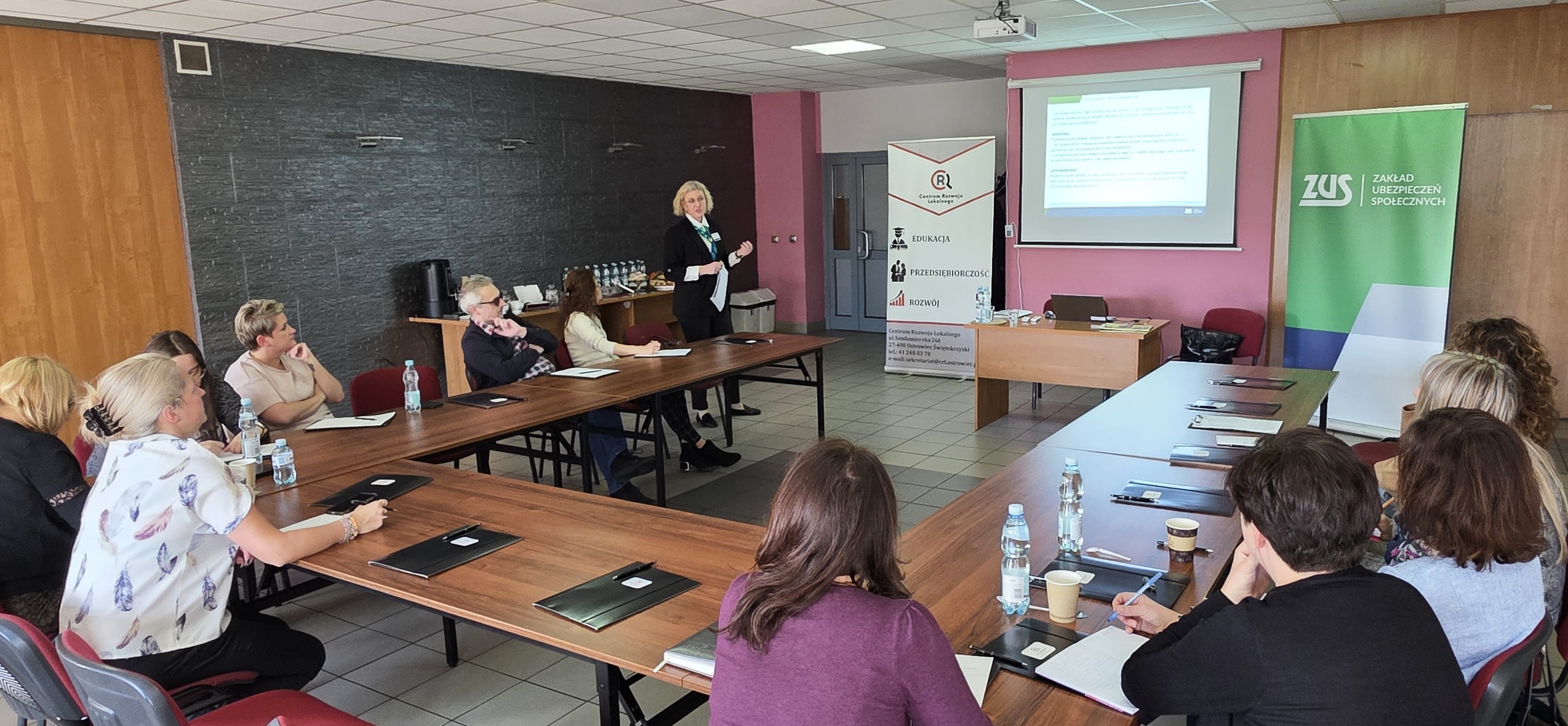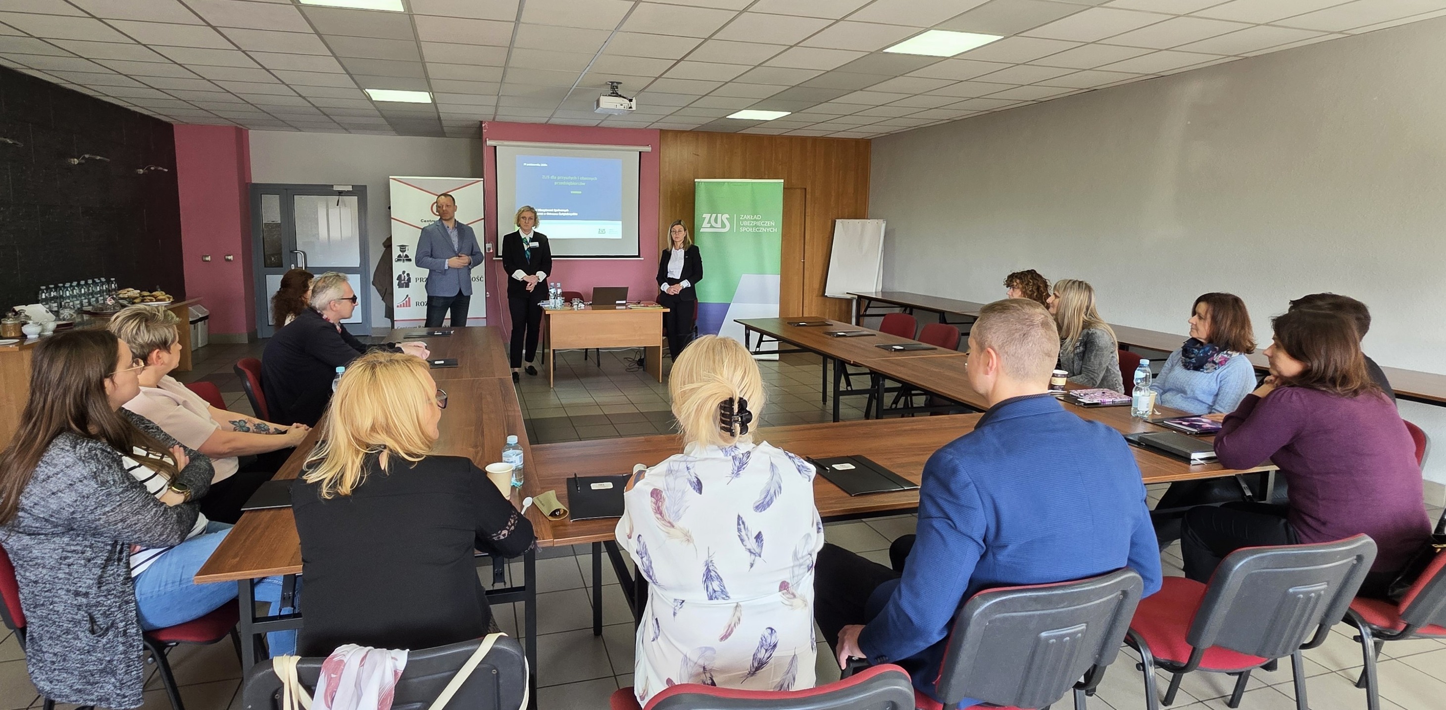 Spotkanie miało na celu przybliżenie aktualnych przepisów oraz omówienie ulg i mechanizmów wsparcia dostępnych dla osób prowadzących działalność gospodarczą, a także zapoznanie uczestników z przewidywanymi zmianami, które wejdą w życie 1 stycznia 2026 r. Spotkanie poprowadziły: Beata Burda, kierownik Inspektoratu ZUS w Ostrowcu Świętokrzyskim, oraz Monika Lipko, kierownik Wydziału Obsługi Klientów.