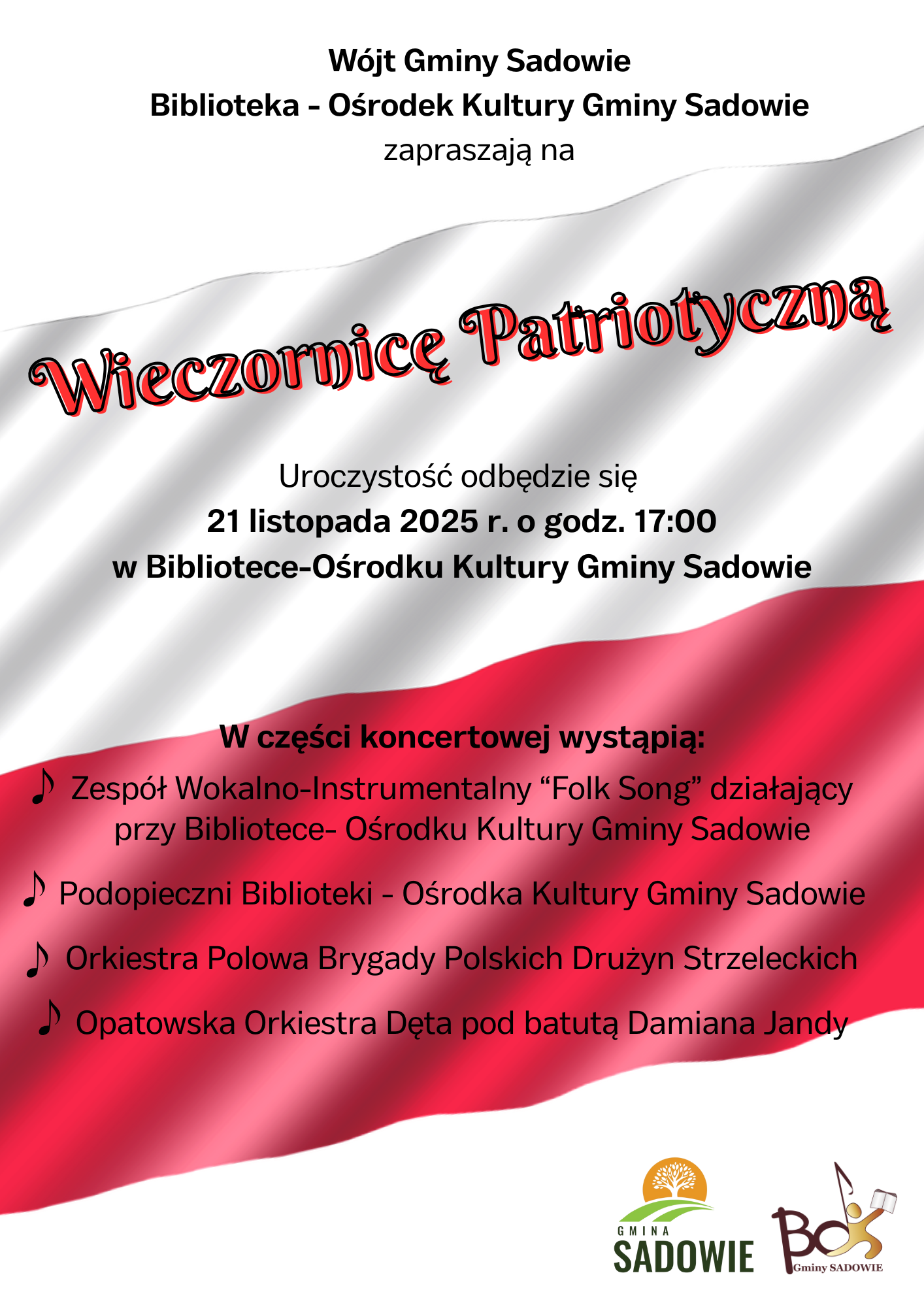 Wieczornica Patriotyczna to wyjątkowe wydarzenie swoim charakterem, które ma na celu podkreślenie znaczenia patriotyzmu i kultury lokalnej. Wydarzenie odbędzie się w Bibliotece - Ośrodku Kultury Gminy Sadowie w dniu 21 listopada 2025 roku o godzinie 17:00.