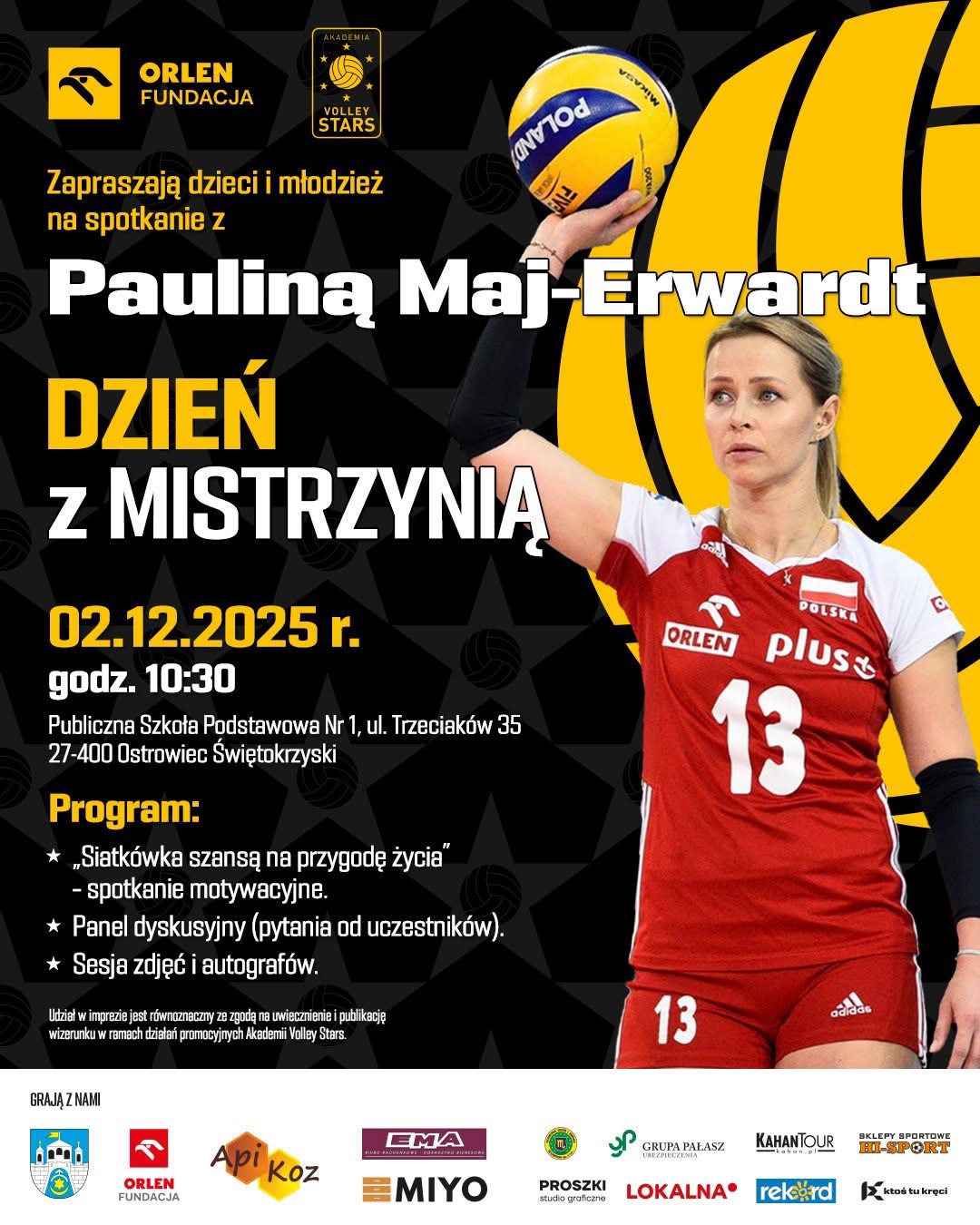 Stowarzyszenie "Akademia Volley Stars" wraz z Fundacją ORLEN serdecznie zapraszają na spotkanie z Pauliną Maj-Erwardt, 108-krotną reprezentantką Polski, brązową medalistką Mistrzostw Europy, wielokrotną Mistrzynią Polski, kilkukrotną zdobywczynią Pucharu i Superpucharu Polski, zwyciężczynią Pucharu CEV.