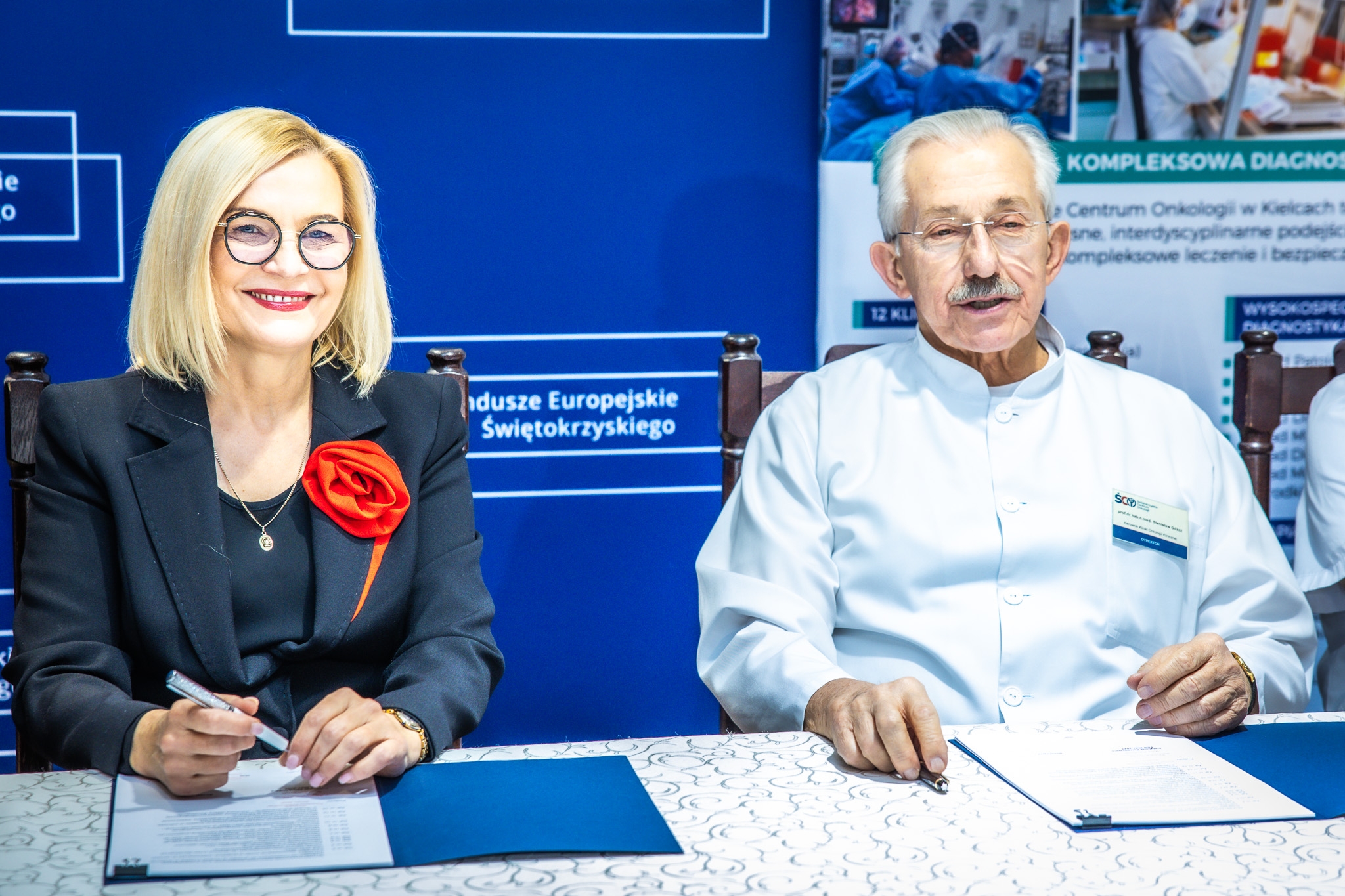 Przy Świętokrzyskim Centrum Onkologii w Kielcach powstanie jedno z najnowocześniejszych centrów badań molekularnych w Polsce - z laboratoriami inżynierii genetycznej, terapii komórkowych i profilowania nowotworów! Dla pacjentów oznacza to szybszą i dokładniejszą diagnostykę, dostęp do innowacyjnych badań klinicznych, tańsze leki oraz szansę na leczenie dopasowane do ich potrzeb. Marszałek Renata Janik, wicemarszałek Marek Bogusławski oraz dyrektor ŚCO prof. Stanisław Góźdź podpisali dziś umowę na dofinansowanie budowy i wyposażenia Centrum Badań Molekularnych. – To jedna z najważniejszych inwestycji tej kadencji, dzięki której w regionie świętokrzyskim będą tworzone terapie przyszłości – podkreśliła marszałek Renata Janik. Łączna wartość inwestycji to ponad 155 mln zł, z czego przeszło 113 mln zł stanowi dofinansowanie z Europejskiego Funduszu Rozwoju Regionalnego. W podpisaniu umowy uczestniczyli: wiceprzewodniczący Sejmiku Województwa Świętokrzyskiego Magdalena Zieleń i Mieczysław Gębski, przewodniczący Komisji Zdrowia, Polityki Społecznej i Spraw Rodziny Sejmiku Województwa Kazimierz Mądzik, z-ca dyrektora ds. Klinicznych ŚCO dr hab. n.med. Jolanta Smok-Kalwat, dr hab. n. med. Artur Kowalik, prof. UJK kierujący Zakładem Diagnostyki Molekularnej ŚCO.