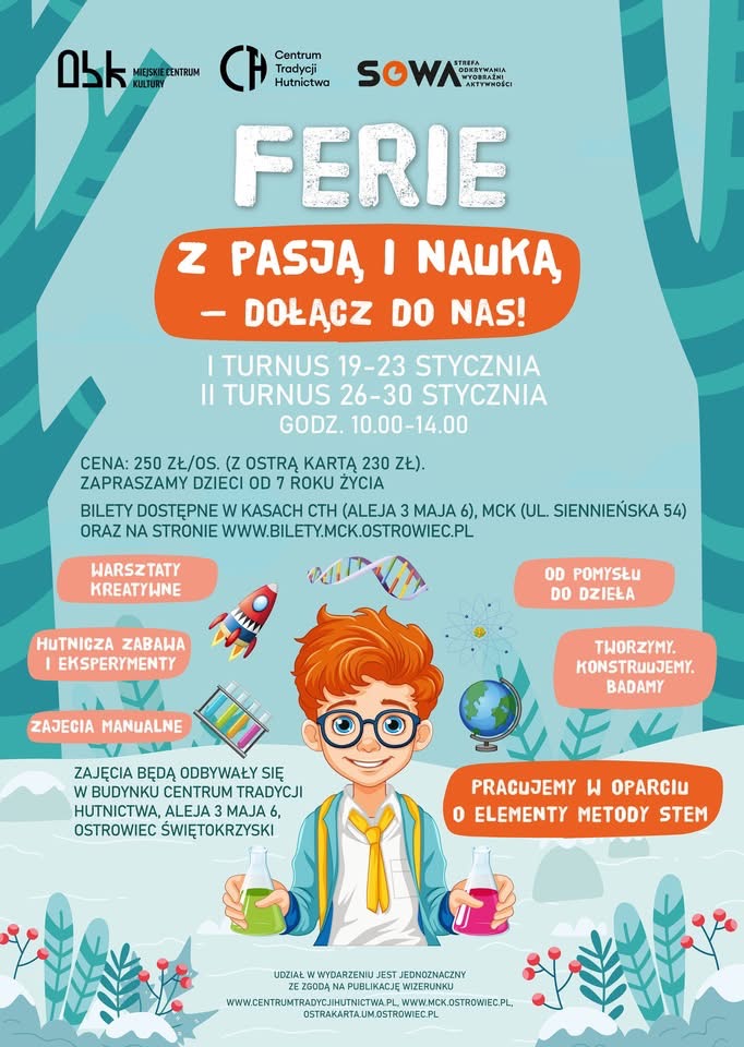 Ferie mogą być okazją do udziału w lokalnych wydarzeniach, warsztatach i pokazach – warto śledzić kulturalne kalendarium. Wiemy, że o czas wolny najmłodszych mieszkańców Ostrowca zadba Biuro Wystaw Artystycznych i Miejskie Centrum Kultury. O poszczególnych wydarzeniach będziemy informować na bieżąco.