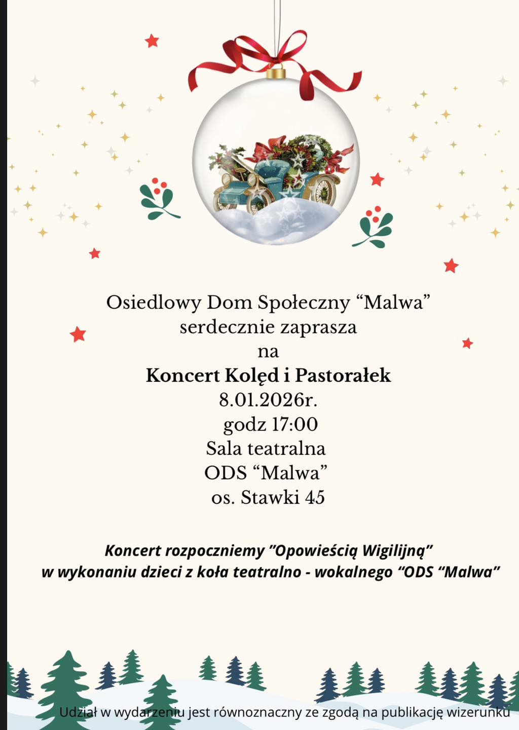 Koncert zainauguruje spektakl „Opowieść Wigilijna”, przygotowany przez dzieci z koła teatralno-wokalnego ODS „Malwa”.