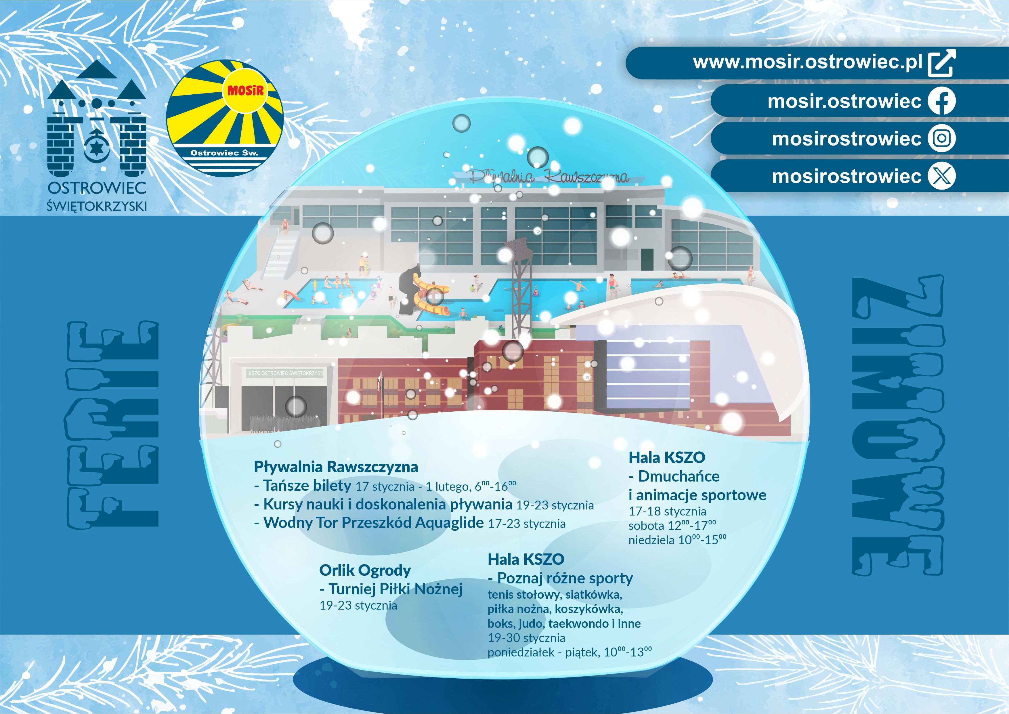 Ferie z MOSiRem to propozycja dla rodzin szukających połączenia aktywności sportowej, zabawy i edukacji. To okazja, by spędzić zimowy czas w ruchu, rozwijać umiejętności i dobrze się bawić pod opieką organizatorów. Zajęcia odbywają się od godziny 9.00.