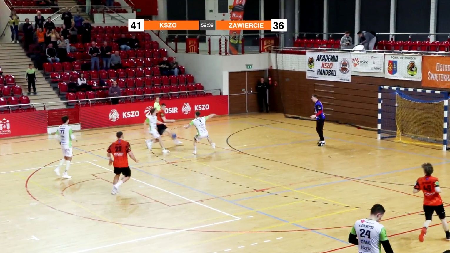 Od pierwszych minut ostrowczanie narzucili twarde warunki gry. Atak był różnorodny. Zawodnicy nie powtarzali jednego schematu. Zmieniali ustawienie i tempo. To tworzyło luki w obronie zespołu z Zawiercia. Pierwsza połowa zakończyła się wynikiem 19:16 dla gospodarzy.