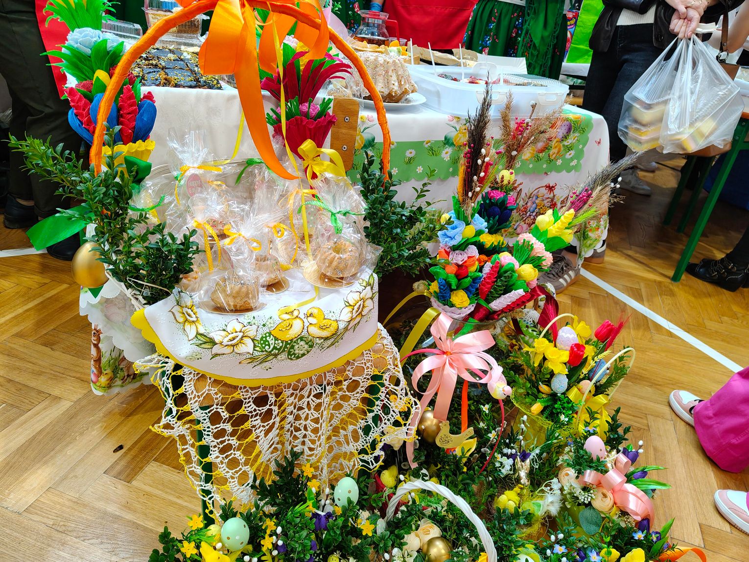 Stoiska uginały się pod domowymi wypiekami i tradycyjnymi potrawami przygotowanymi przez Koła Gospodyń Wiejskich. Można było kupić palmy wielkanocne wykonane z naturalnych materiałów, ręcznie robione ozdoby do dekoracji stołów oraz szeroki wybór ciast: makowce, serniki, tradycyjne placki i inne świąteczne słodkości. Panie z lokalnych kół chętnie dzieliły się przepisami i opowieściami o tradycjach, przyciągając zarówno seniorów, jak i młodsze pokolenia.