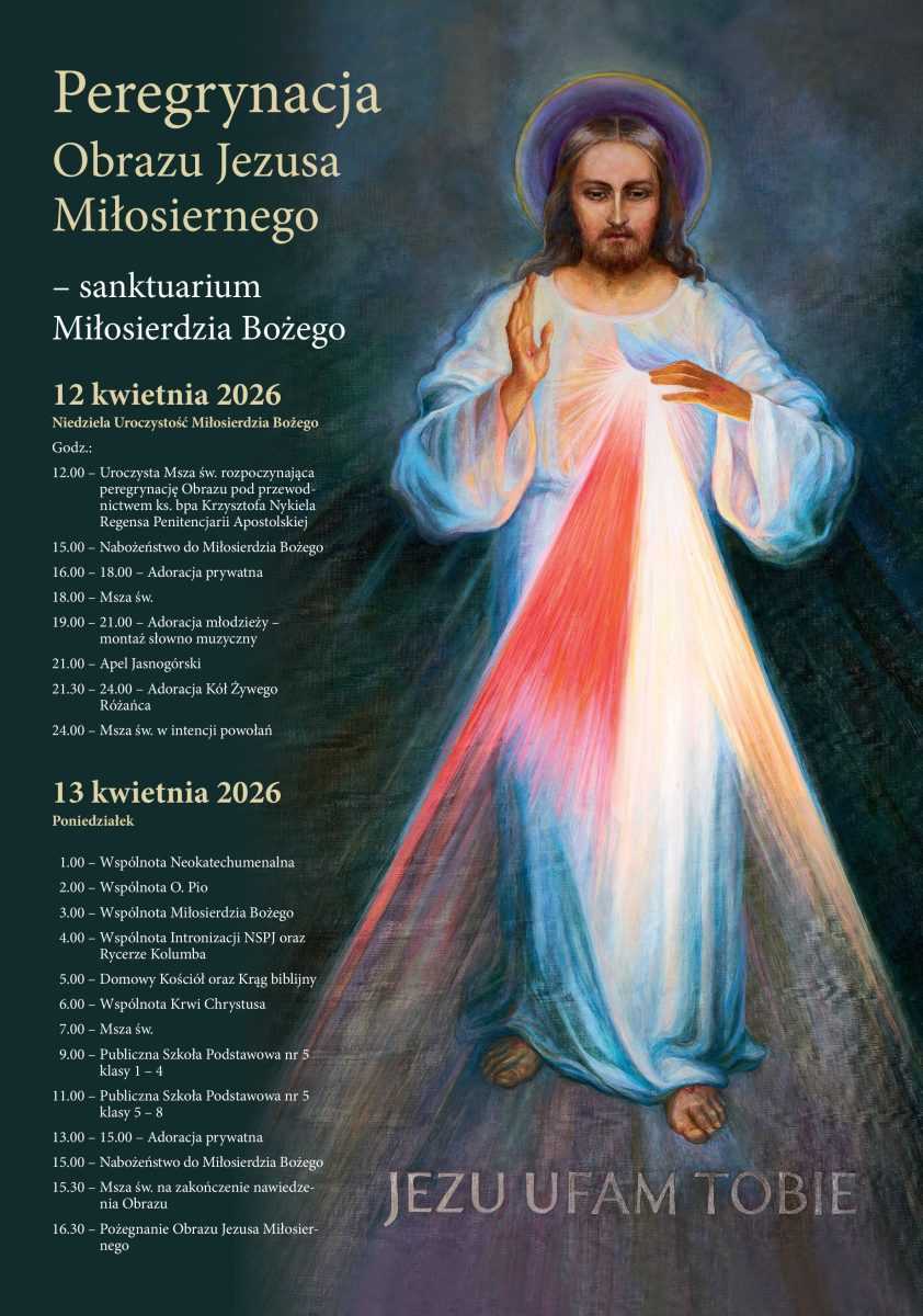 Obraz nawiedzenia, przygotowany specjalnie na peregrynację, nawiązuje do pierwszego wizerunku Jezusa Miłosiernego, namalowanego w Wilnie w 1934 r. przez Eugeniusza Kazimirowskiego według wskazówek św. Faustyny. Przedstawia on Zmartwychwstałego Chrystusa w białej szacie, z uniesioną prawą ręką w geście błogosławieństwa i promieniami czerwonym oraz bladym, wypływającymi z Jego Serca. Promienie te symbolizują krew i wodę, które wypłynęły z przebitego boku Jezusa – źródło sakramentów Kościoła, oczyszczenia z grzechów i łaski uświęcenia. Obraz przypomina zarówno wydarzenia paschalne, jak i spotkanie Zmartwychwstałego Pana z uczniami w Wieczerniku.