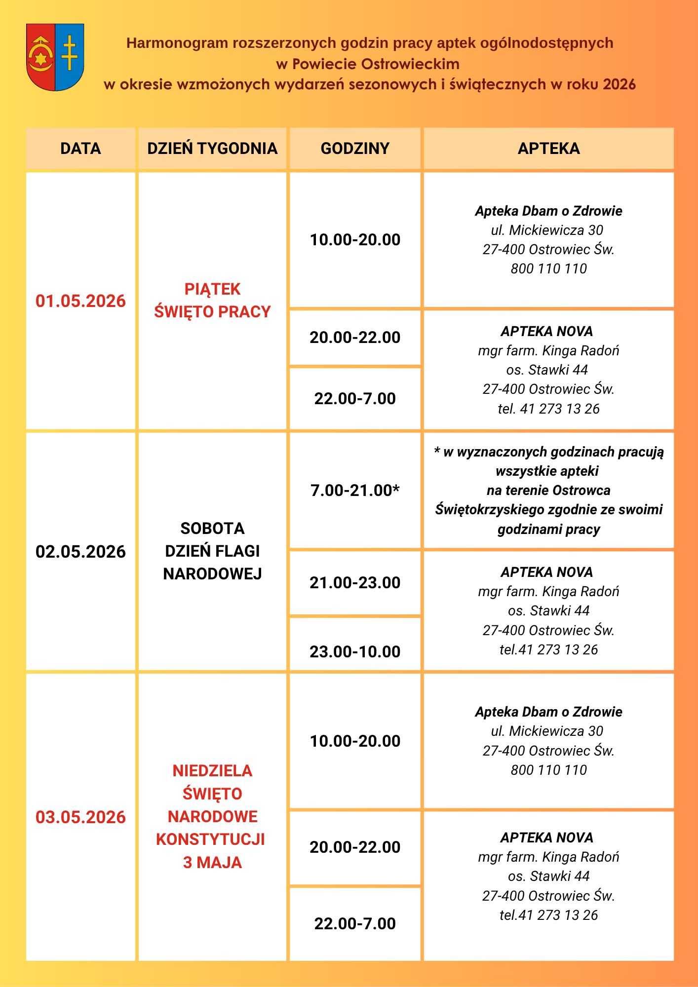 W majowy weekend w Ostrowcu Świętokrzyskim dyżurować będzie apteka zlokalizowana w osiedlu Stawki. Placówka będzie czynna od godziny 20:00 do godziny 7:00 kolejnego dnia.