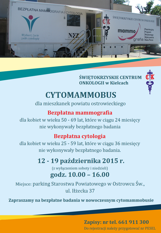Cytomammobus Świętokrzyskiego Centrum Onkologii zaparkował na parkingu Starostwa Powiatowego w Ostrowcu Św. Mammografię mogą w nim wykonywać kobiety w wieku od 50 do 69 lat, które w ciągu ostatnich dwóch lat nie wykonywały takich badań oraz kobiety w wieku od 25 do 59 lat, które w ciągu ostatnich trzech lat nie wykonywały badań cytologicznych.